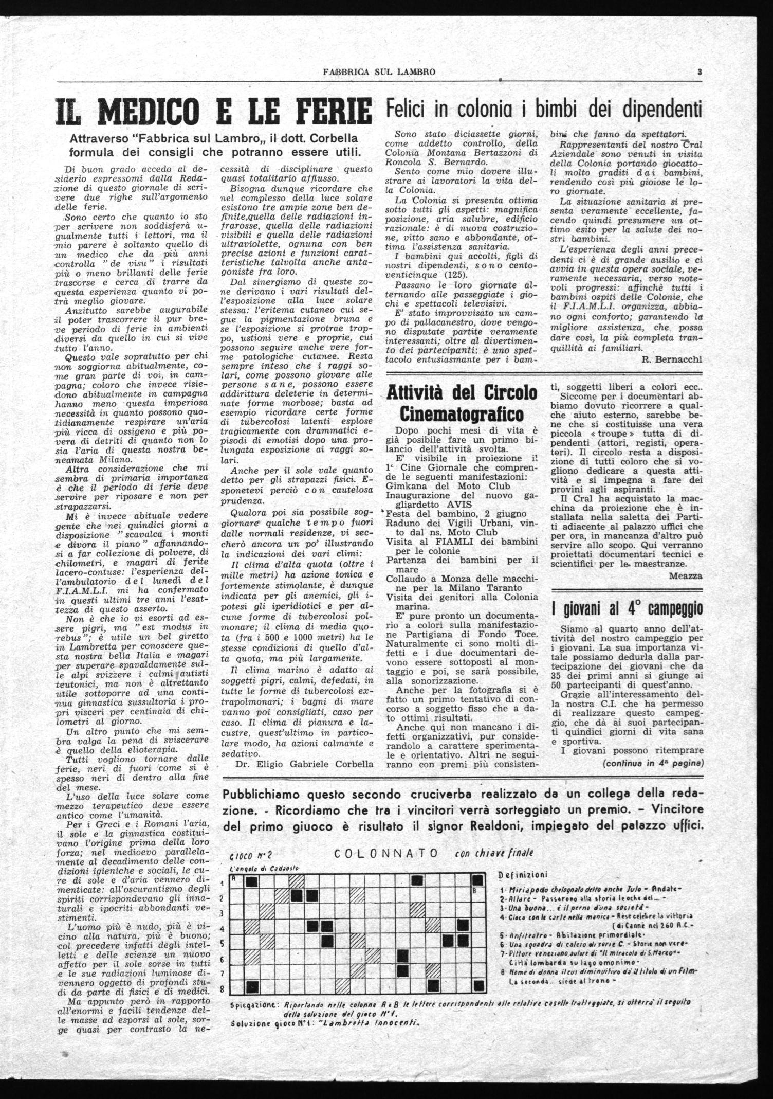 L'esperienza degli anni precedenti ci è di grande ausilio e ci avvia in questa opera sociale, veramente necessaria, verso notevoli progressi: af finchè tutti i bambini ospiti delle Colonie, che il F.I.A.M.L.I. organizza, abbiano ogni conforto; garantendo le migliore assistenza, che possa dare così, la più completa tranquillità ai familiari.