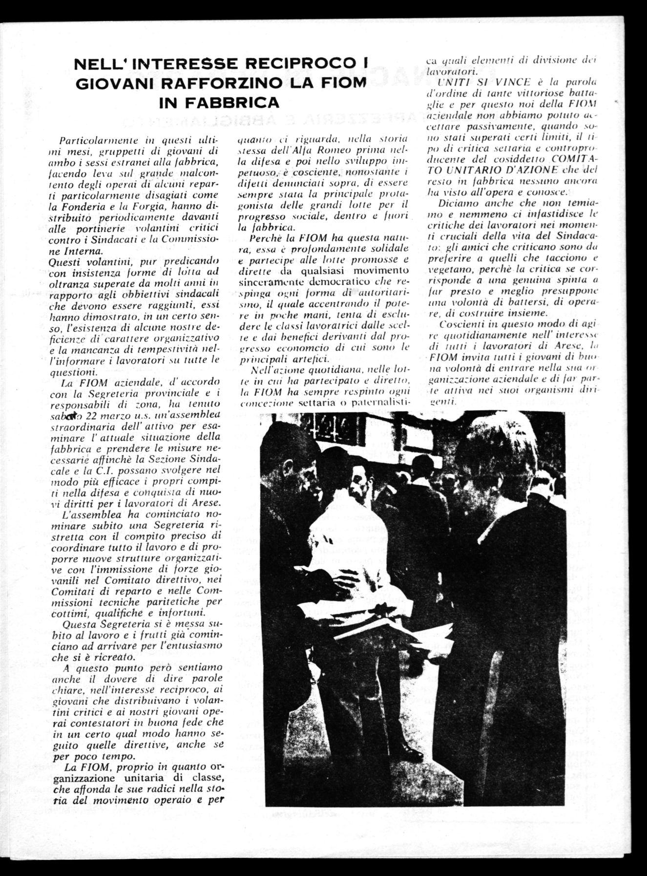 Coscienti in questo modo di agi re quotidianamente nell' interessc di lutti i lavoratori di Arese, FIOM invita tutti i giovani di buona volontà di entrare nella stia or• ganizzazione aziendale e di far par-te attiva nei suoi organismi diriL!culli.