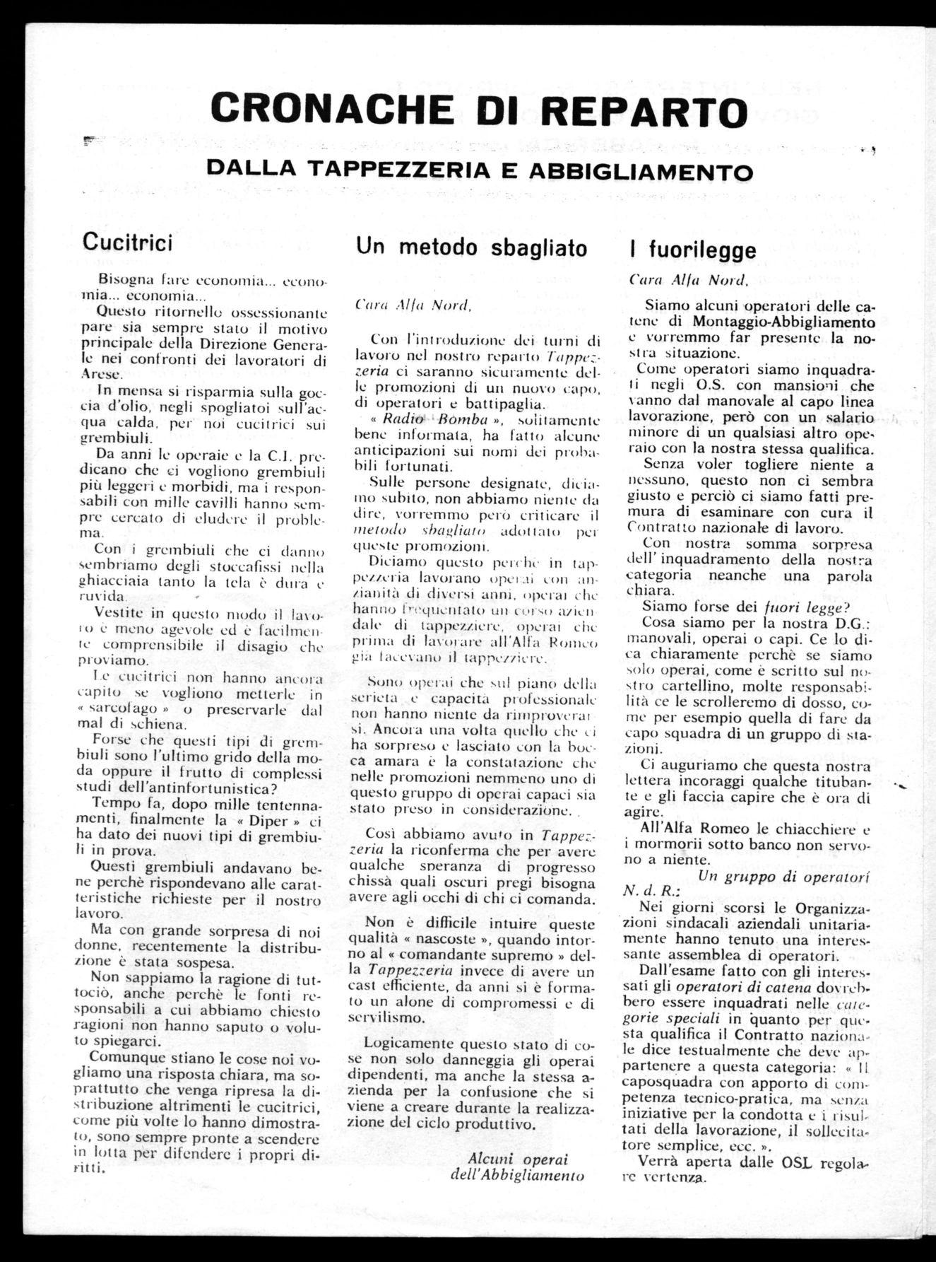 Questa politica basata sulla dequalificazione del lavoro, sulla limitazione dei passaggi di categoria e sulla limitazione degli aumenti di merito, creava uno stato di tensione che sfociava nella lotta sindacale. Scesi in sciopero articolato, i lavoratori si riunivano in assemblea libera e assistiti dalle Organizzazioni sindacali davano vita ad una nuova esperienza sindacale che sfociava, dopo quattro settimane, nella firma di un accordo che prevedeva un certo numero di passaggi di categoria e aumenti di merito; accordo che se non è il punto di arrivo delle giuste aspirazioni degli operai è un punto molto importante di partenza verso la normalizzazione nel reparto.