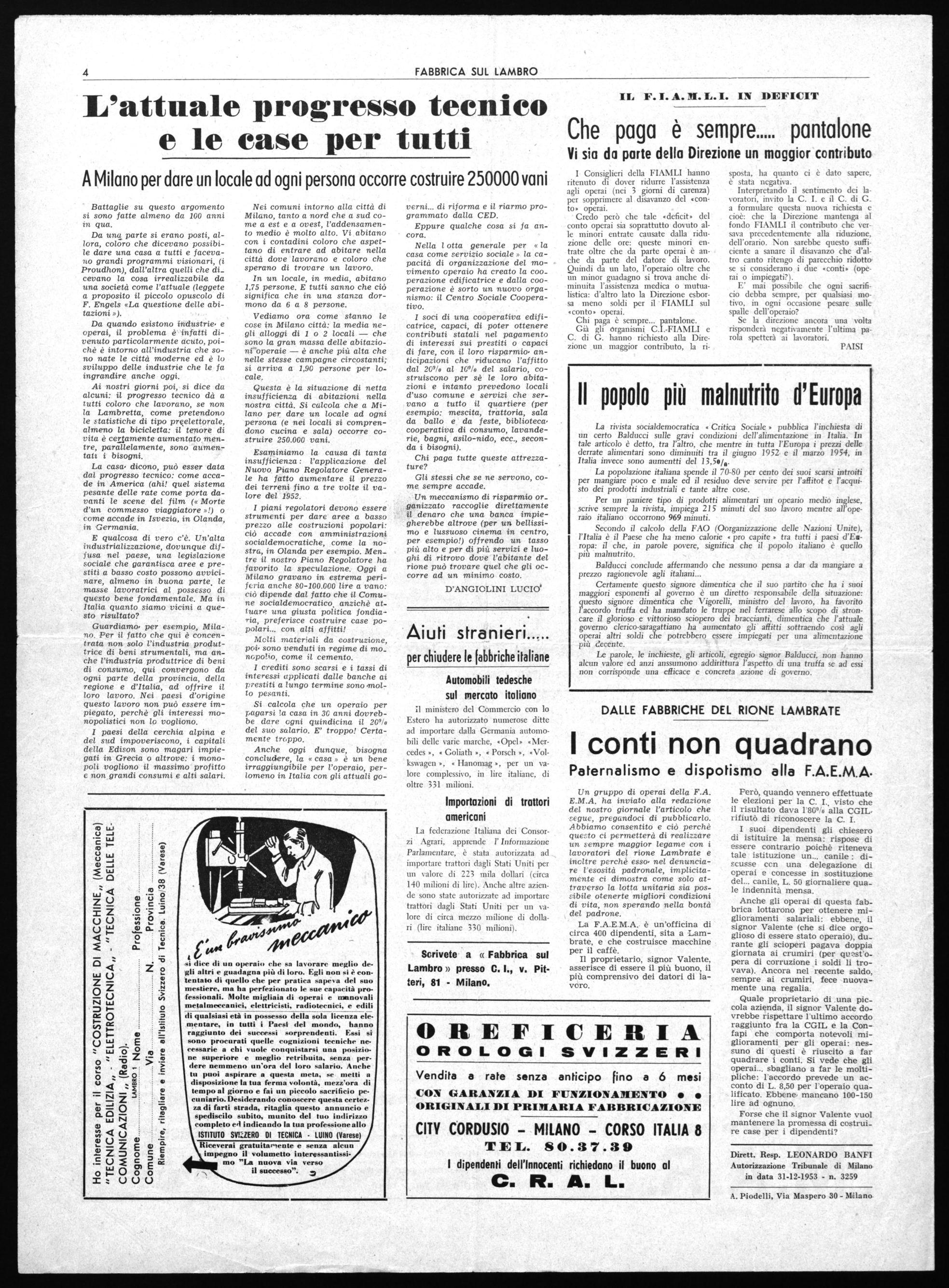 La rivista socialdemocratica • Critica Sociale » pubblica l'inchiesta di un certo Balducci sulle gravi condizioni dell'alimentazione in Italia. In tale articolo è detto, tra l'altro, che mentre in tutta l'Europa i prezzi delle derrate alimentari sono diminuiti tra il giugno 1952 e il marzo 1954, in Italia invece sono aumentti del 13,5•14 La popolazione italiana spende il 70-80 per cento dei suoi scarsi introiti per mangiare poco e male ed il residuo deve servire per l'affitot e l'acquisto dei prodotti industriali e tante altre cose.