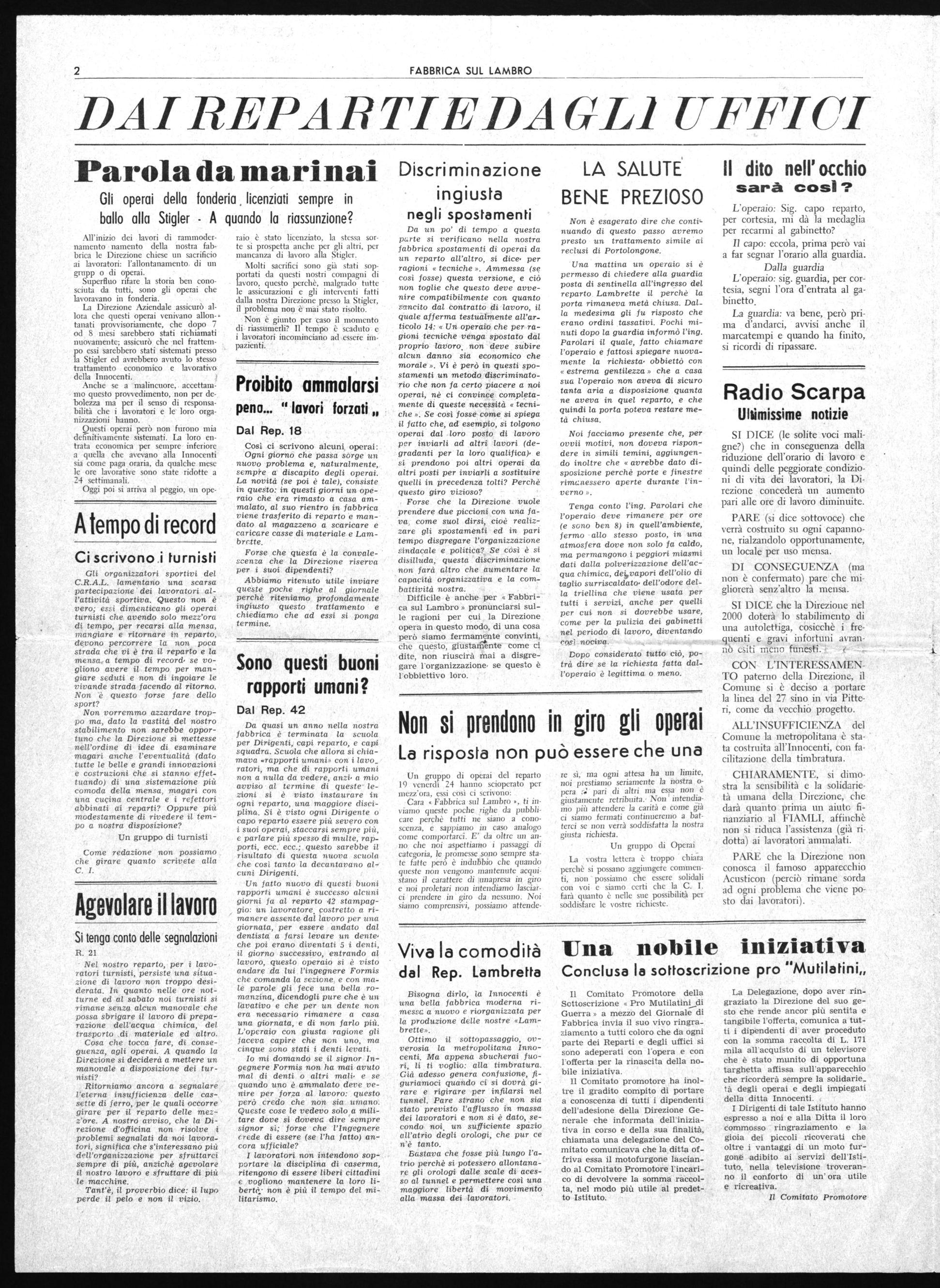 Così ci scrivono alcuni, operai: Ogni giorno che passa sorge un nuovo problema e, naturalmente, sempre a discapito degli operai. La novità (se poi è tale), consiste in questo: in questi giorni un operaio che era rimasto a casa ammalato, al suo rientro in fabbrica viene trasferito di reparto e mandato al magazzeno a scaricare e caricare casse di materiale e Lambrette. Forse che questa è la convalescenza che la Direzione riserva per i suoi dipendenti?