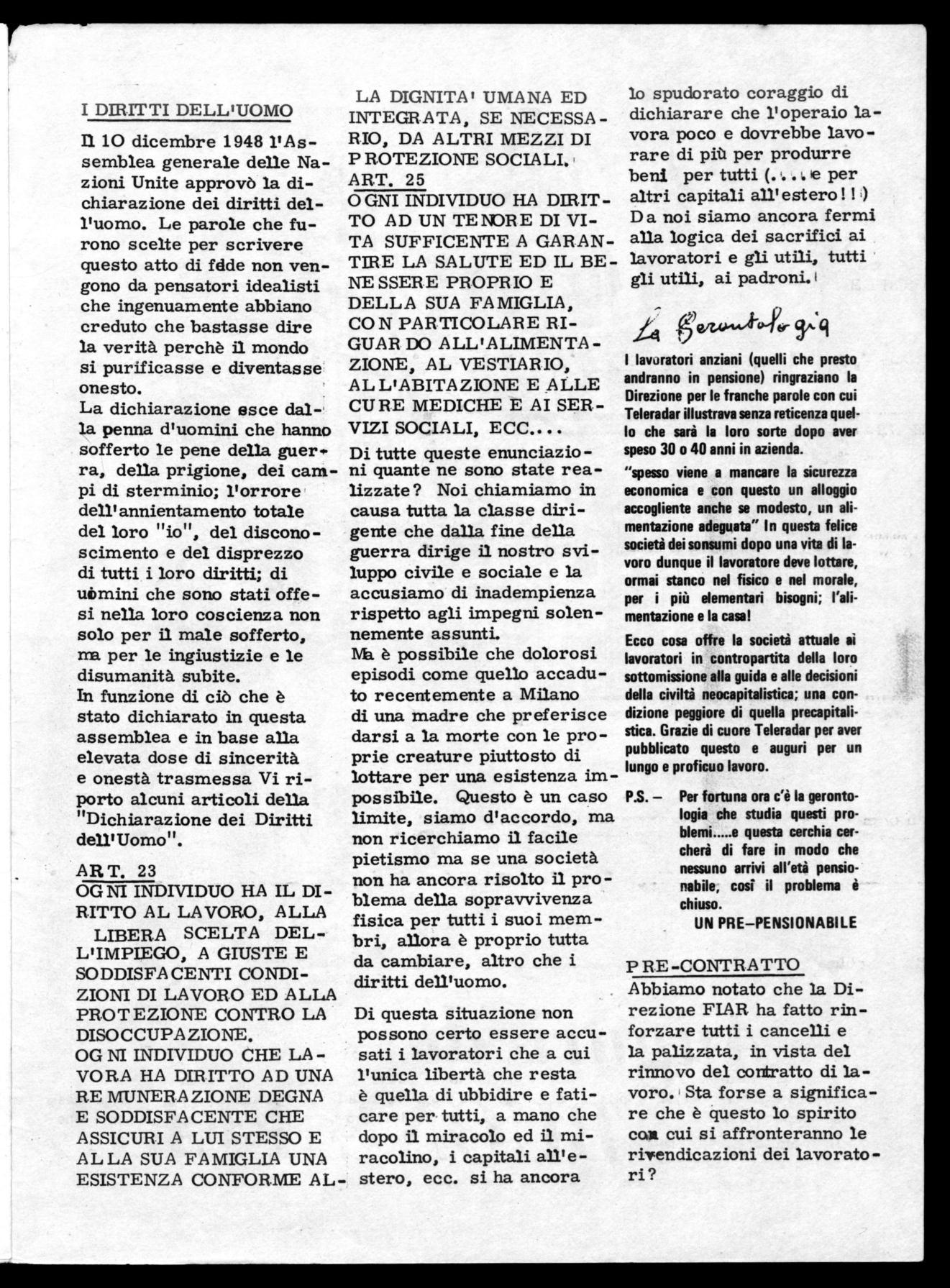 Ecco cosa offre la società attuale ai lavoratori in contropartita della loro sottomissione alla guida e alle decisioni della civiltà neocapitalistica; una condizione peggiore di quella precapitalistica. Grazie di cuore Teleradar per aver pubblicato questo e auguri per un lungo e proficuo lavoro.