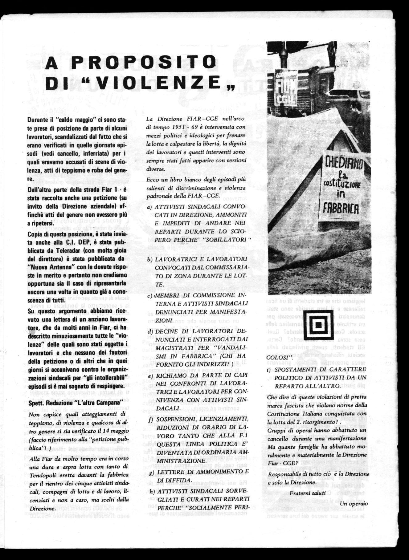 Su questo argomento abbiamo ricevuto una lettera di un anziano lavoratore, dhe da molti anni in Fiar, ci ha descritto minuziosamente tutte le "violenze" delle quali sono stati oggetto i lavoratori e che nessuno dei fautori della petizione o di altri che in quei giorni si accanivano contro le organizzazioni sindacali per "gli intollerabili" episodi si è mai sognato di respingere.