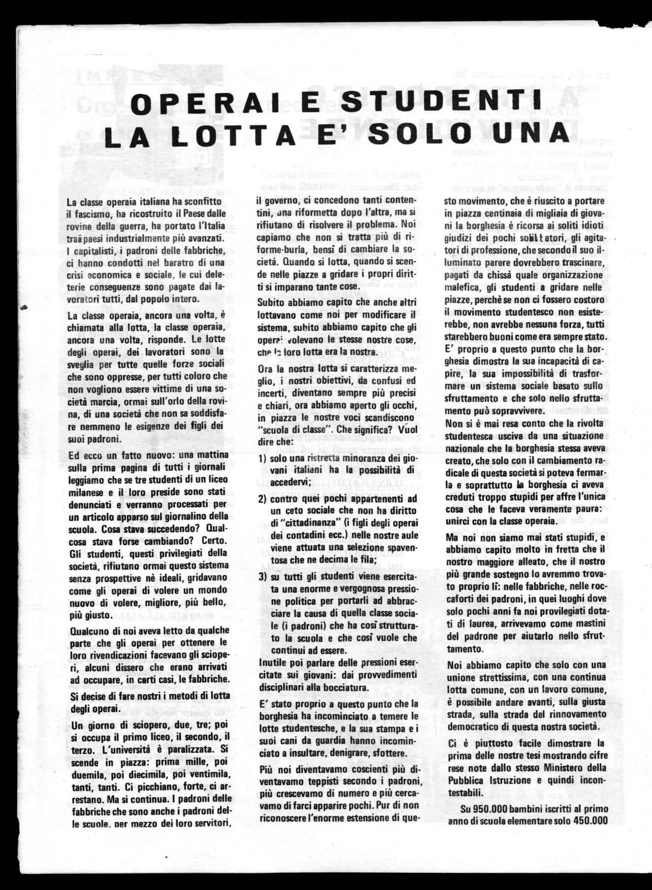 E allora lo studente, svegliato dal suo illusorio sogno dall'esempio delle lotte operaie, si pone accanto al proletariato, come forza nuova e ormai matura, per la radicale trasformazione della società, per la formazione di un uomo nuovo, un uomo vero, l'uomo del domani.