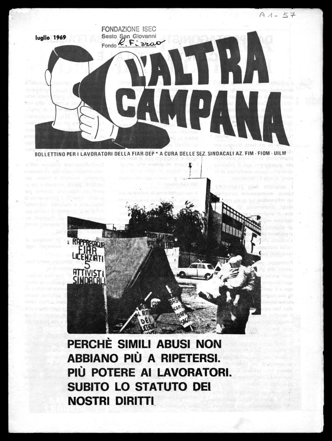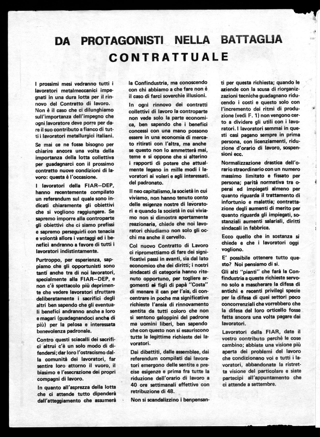 Lavoratori della FIAR, date il vostro contributo perchè le cose cambino; abbiate una visione più aperta dei problemi del lavoro che condizionano voi e tutti i lavoratori, abbandonate la ristretta visione del particolare e siate partecipi all'appuntamento che ci attende a settembre.