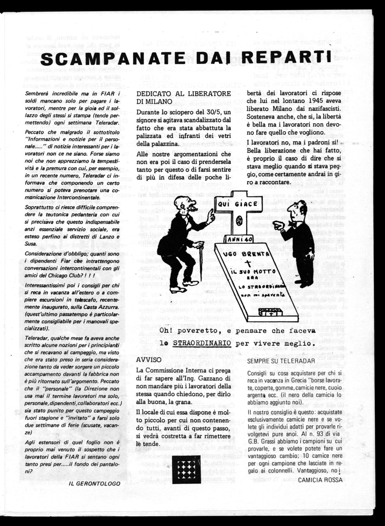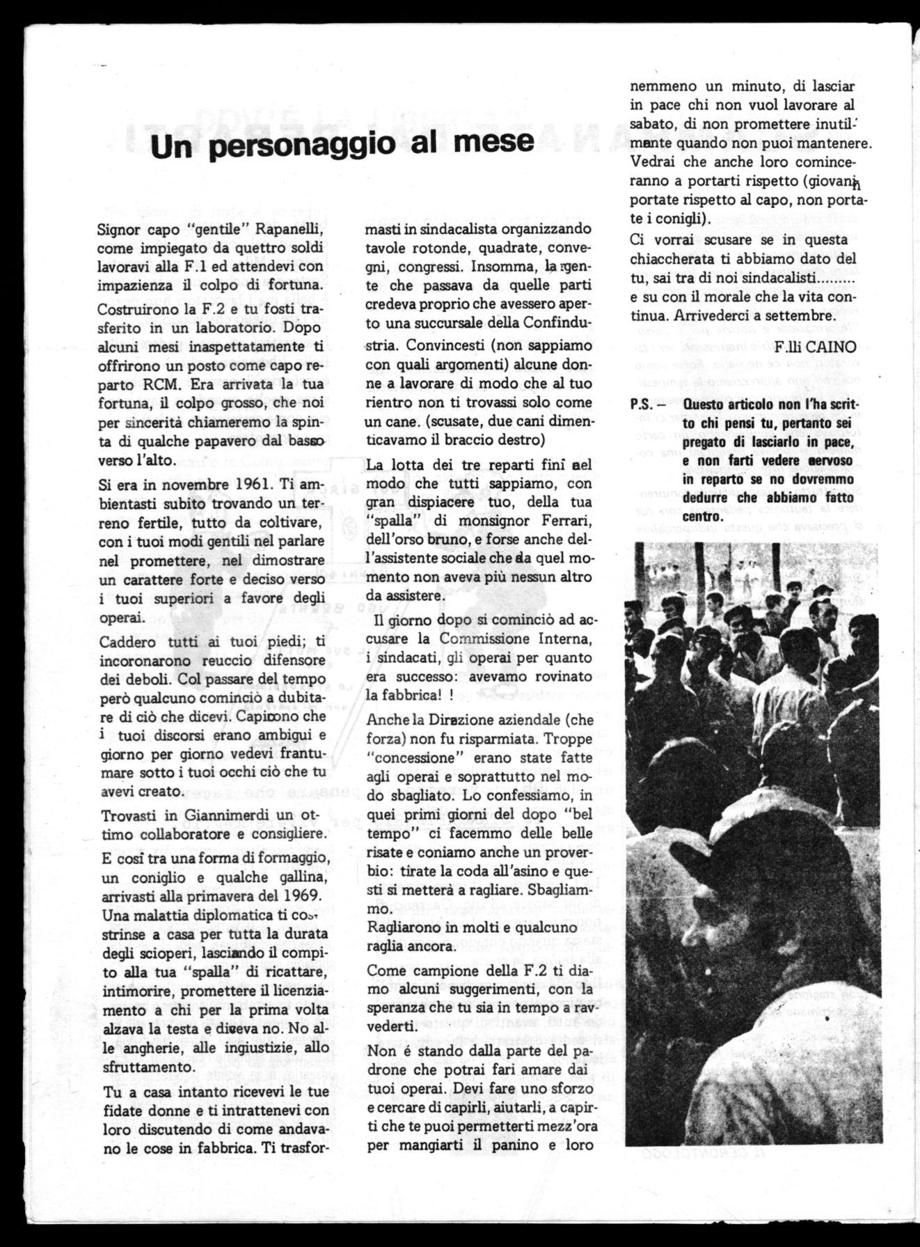 E' infatti noto a tutti che alla F.2 non possono accedere, non diciamo i comunisti, ma nemmeno coloro che manifestano apertamente le loro idee sindacali, mentre è arcinoto che questa fabbrica è comodo rifugio per qualcuno che il 25 aprile ha dovuto far le valigie e riparare oltre frontiera in attesa che le cose si mettessero a posto. Per gli amanti del nero la F.2 è il loro paradiso terrestre.
