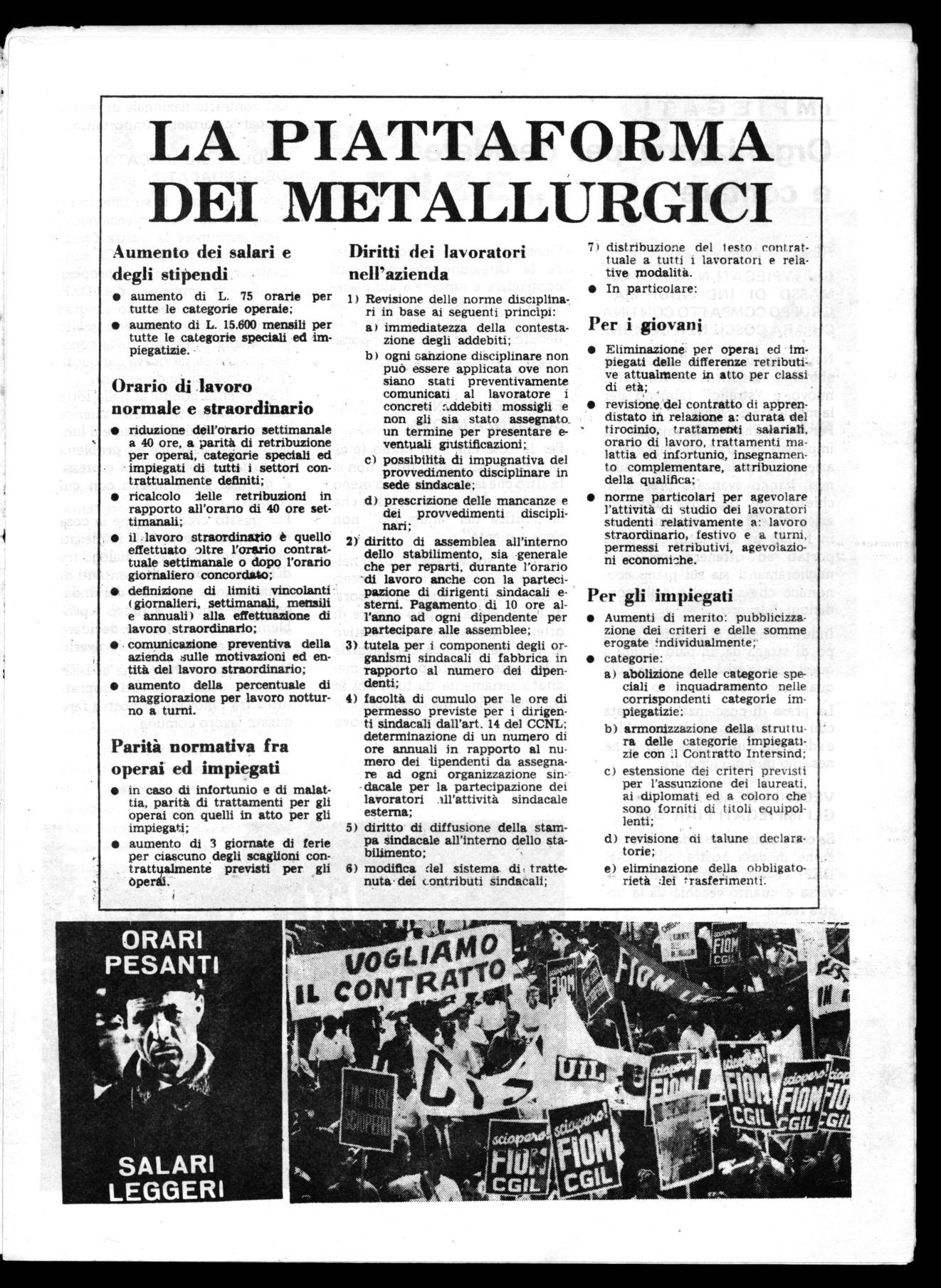 Normalizzazione drastica dell'orario straordinario con un numero massimo limitato e fissato per persona; parità normativa tra operai ed impiegati almeno per quanto riguarda il trattamento di infortunio e malattia; contrattazione degli aumenti di merito per quanto riguarda gli impiegati, sostanziali aumenti salariali, diritti sindacali in fabbrica.