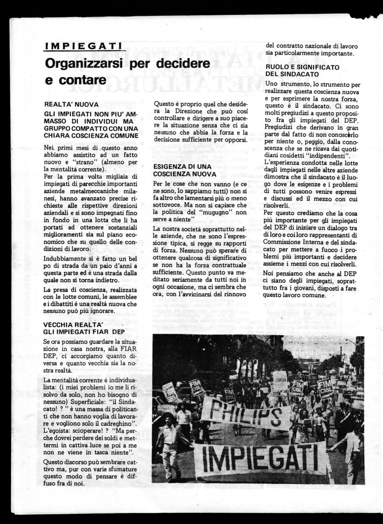Uno strumento, lo strumento per realizzare questa coscienza nuova e per esprimere la nostra forza, questo è il sindacato. Ci sono molti pregiudizi a questo proposito fra gli impiegati del DEP. Pregiudizi che derivano in gran parte dal fatto di non conoscèrlo per niente o, peggio, dalla conoscenza che se ne ricava dai quotidiani cosidetti "indipendenti".