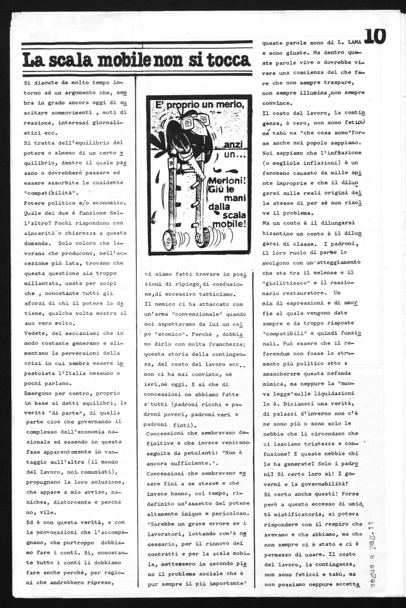 "Sarebbe un grave errore se i lavoratori, lottando com'è ne cessario, per il rinnovo dei contratti e per la scala mobile, mettessero in secondo pia no il problema sociale che è pur sempre il più importante"