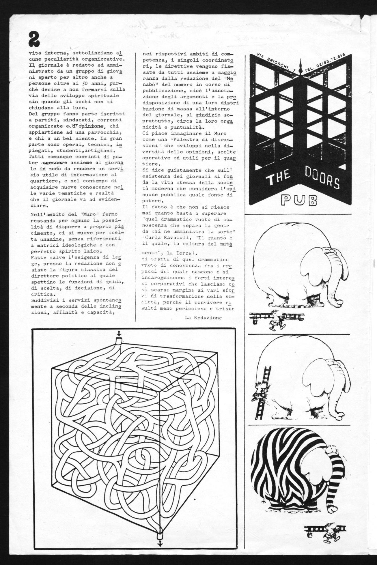 Nell'ambito del "Muro" fermo restando per ognuno la possi— lità di disporre a proprio pia cimento, ci si muove per scel— ta unanime, senza riferimenti a matrici ideologiche e con perfetto spirito laico. Fatte salve l'esigenza di lel ge, presso la redazione non e sirte la figura classica del direttore politico al quale spettino le funzioni di guida, di scelta, di decisione, di critica.