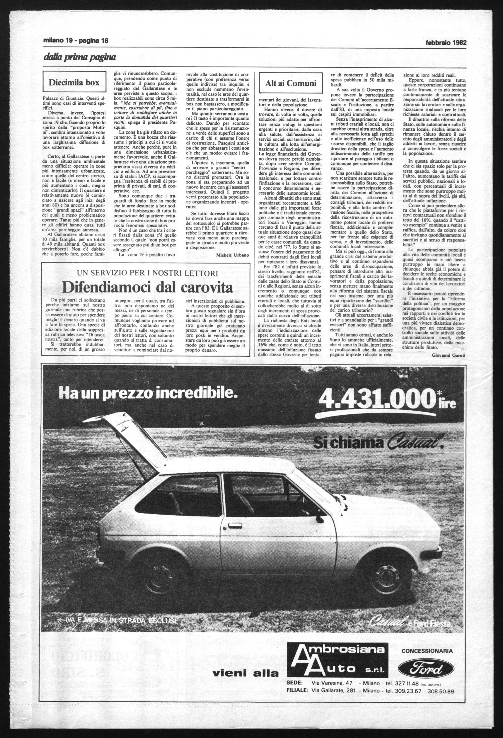 E se ogni famiglia avesse un box-auto? Al Gallaratese ci stanno tentando. Il Consiglio di zona ha messo a punto una proposta precisa. Una riunione con i responsabili dell'Amministrazione comunale si è già svolta. Erano presenti, oltre al presidente della Zona, Danilo Pasquini, l'assessore all'Urbanistica Maurizio Mottini e il suo "collega" al Demanio Giuliano Banfi. Del resto, il progetto della zona 19 (Qt8 - San Siro - Gallaratese) segue i binari di una filosofia che l'Amministrazione municipale ha già fatto propria Due gli obiettivi. Da una parte difendere il capitale - auto dalle interperanze del clima, ma anche della delinquenza. Insomma, il box o il garage indirettamente sono un risparmio. Il fatto è, appunto, che è difficile trovarlo. Questo è il primo problema. Diciamo quello individuale. Ma ce n'è un altro: l'auto quando è posteggiata in strada (o magari su un marciapiede o su un'aiuola) ruba spazio alla città (e l'imbruttisce).