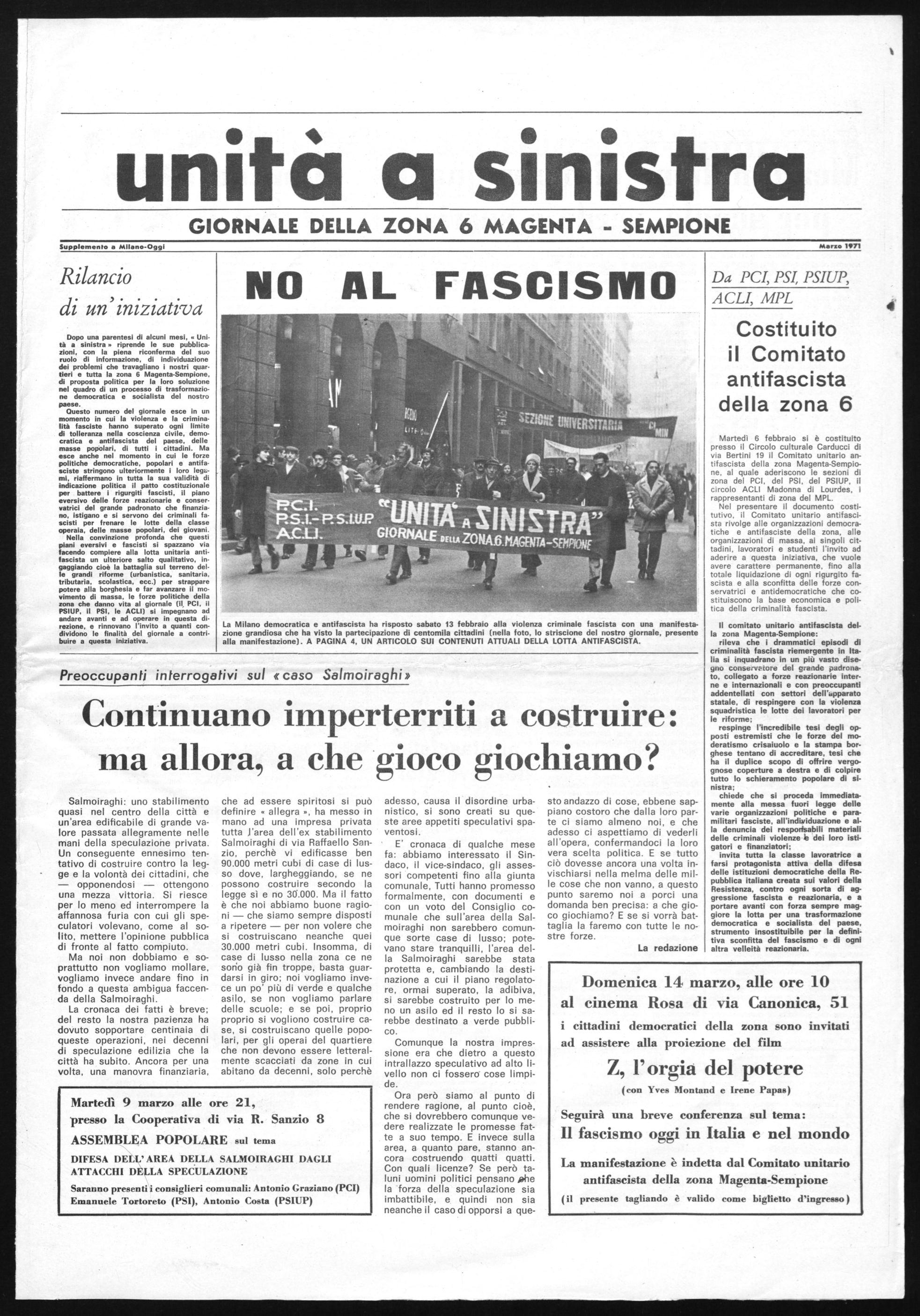 Martedì 6 febbraio si è costituito presso il Circolo culturale Carducci di via Bertini 19 il Comitato unitario antifascista della zona Magenta-Sempione, al quale aderiscono le sezioni di zona del PCI, del PSI, del PSIUP, il circolo ACLI Madonna di Lourdes, rappresentanti di zona del MPL.