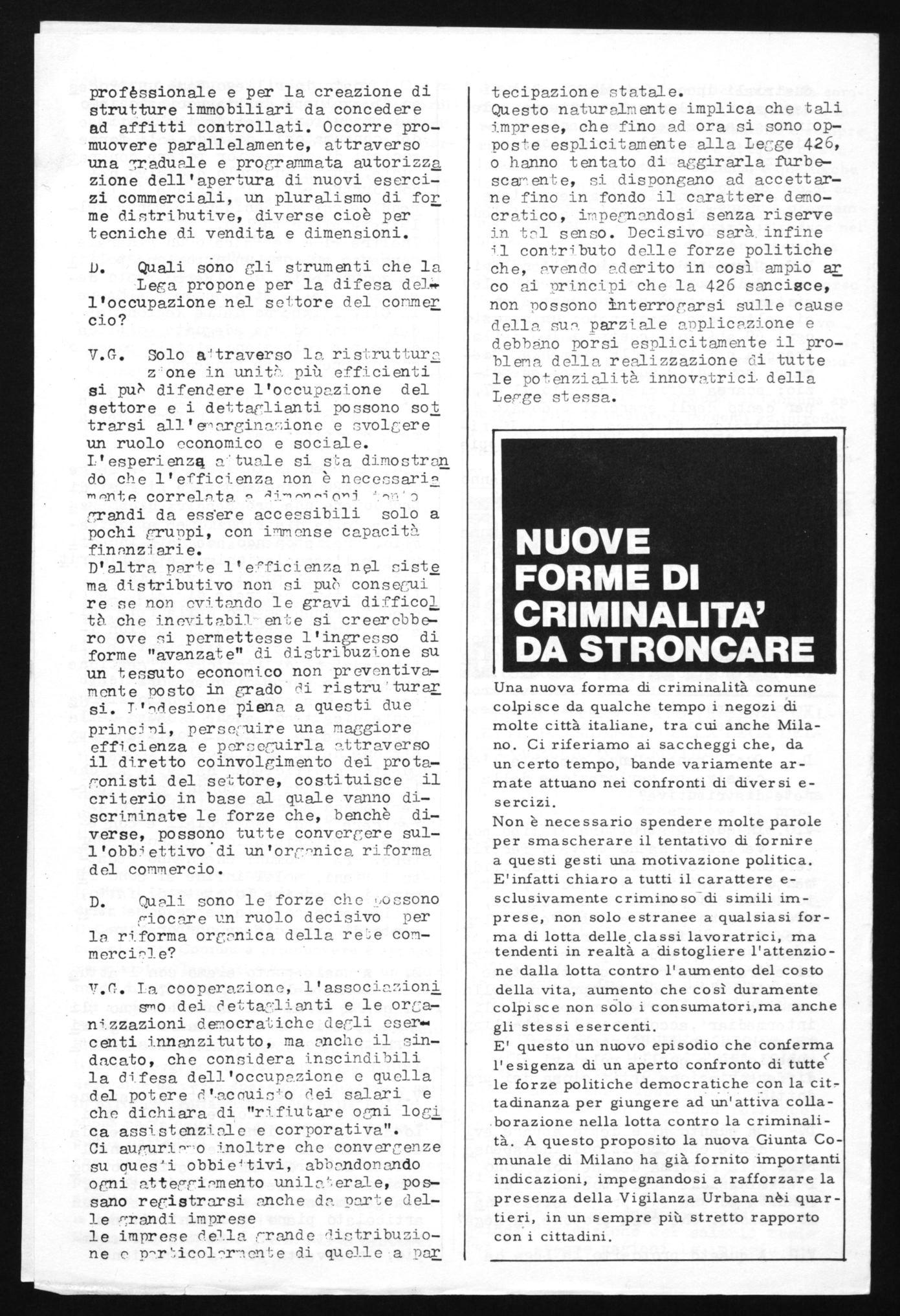 Non è necessario spendere molte parole per smascherare il tentativo di fornire a questi gesti una motivazione politica. E'infatti chiaro a tutti il carattere esclusivamente criminoso di simili imprese, non solo estranee a qualsiasi forma di lotta delle classi lavoratrici, ma tendenti in realtà a distogliere l'attenzione dalla lotta contro l'aumento del costo della vita, aumento che così duramente colpisce non solo i consumatori,ma anche gli stessi esercenti.