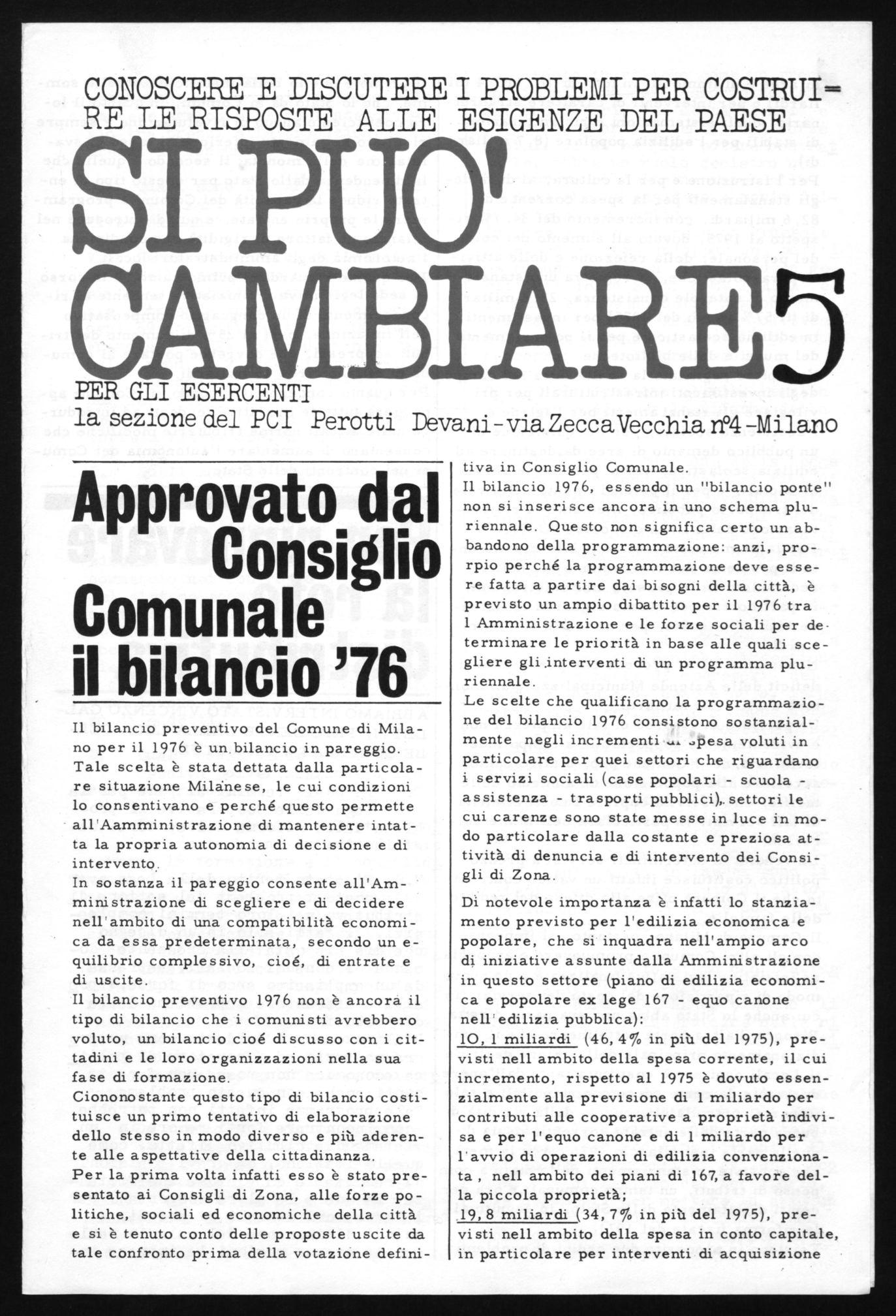 Il bilancio preventivo del Comune di Milano per il 1976 è un bilancio in pareggio. Tale scelta è stata dettata dalla particolare situazione Milanese, le cui condizioni lo consentivano e perché questo permette all'Aamministrazione di mantenere intatta la propria autonomia di decisione e di intervento.