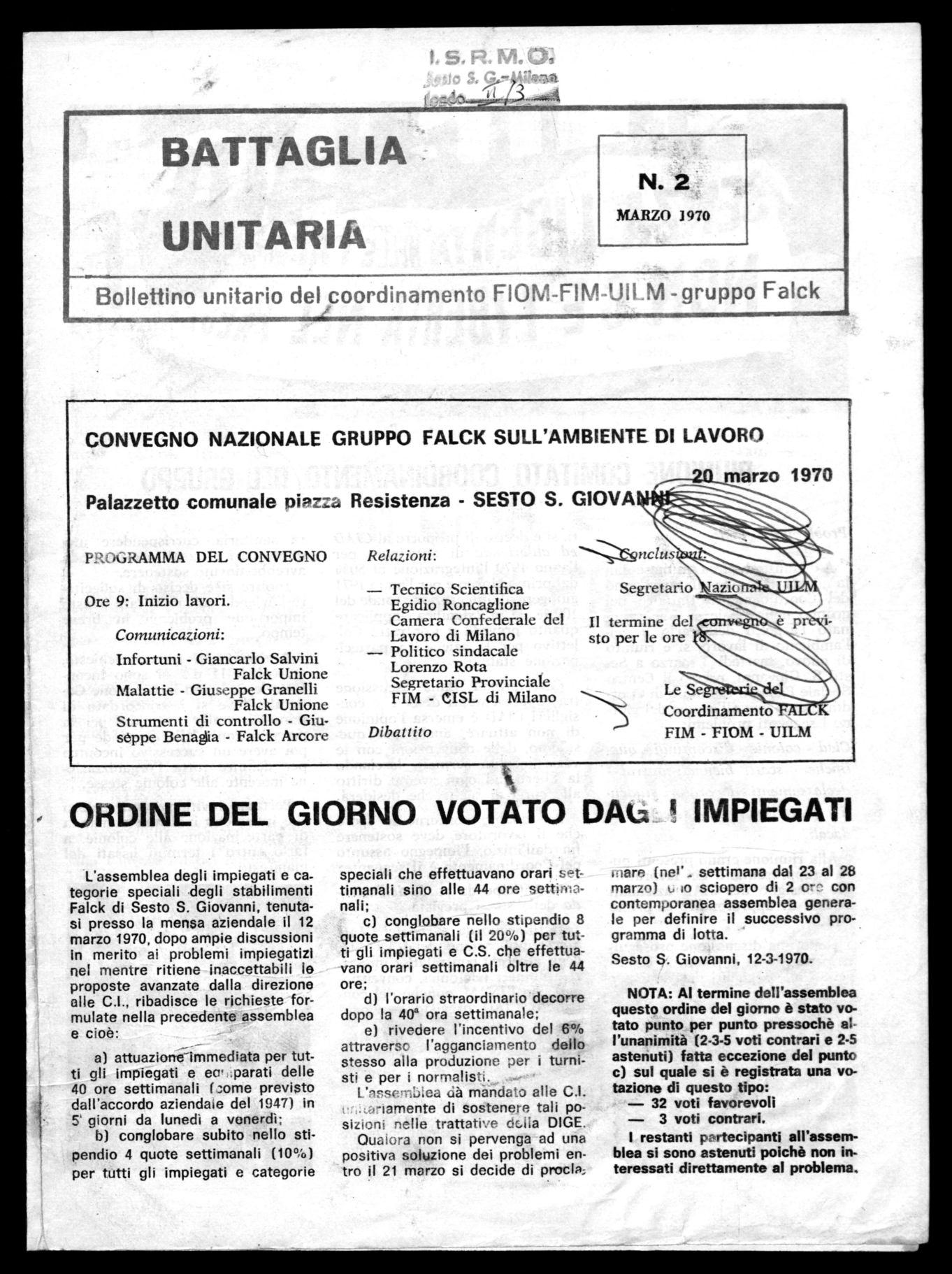 L'assemblea degli impiegati e categorie speciali degli stabilimenti Falck di Sesto S. Giovanni, tenutasi presso la mensa aziendale il 12 marzo 1970, dopo ampie discussioni in merito ai problemi impiegatizi nel nunire ritiene inaccettabili le proposte avanzate dalla direzione alle C.l.. ribadisce le richieste formulate nella precedente assemblea e cioè: