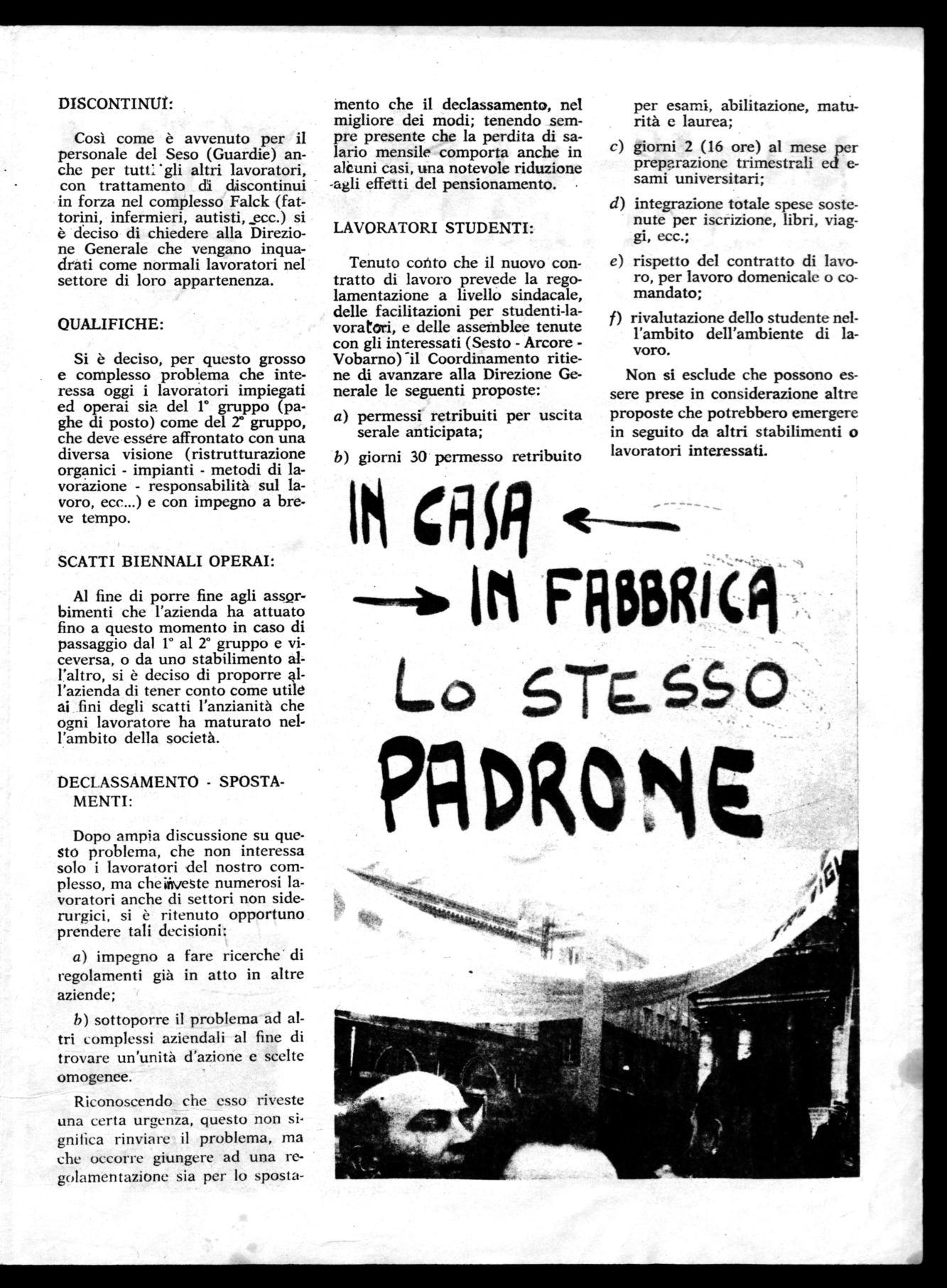Così come è avvenuto per il personale del Seso (Guardie) anche per tutti 'gli altri lavoratori, con trattamento di discontinui in forza nel complesso Falck (fattorini, infermieri, autisti, ecc.) si è deciso di chiedere alla Direzione Generale che vengano inquadrati come normali lavoratori nel settore di loro appartenenza.