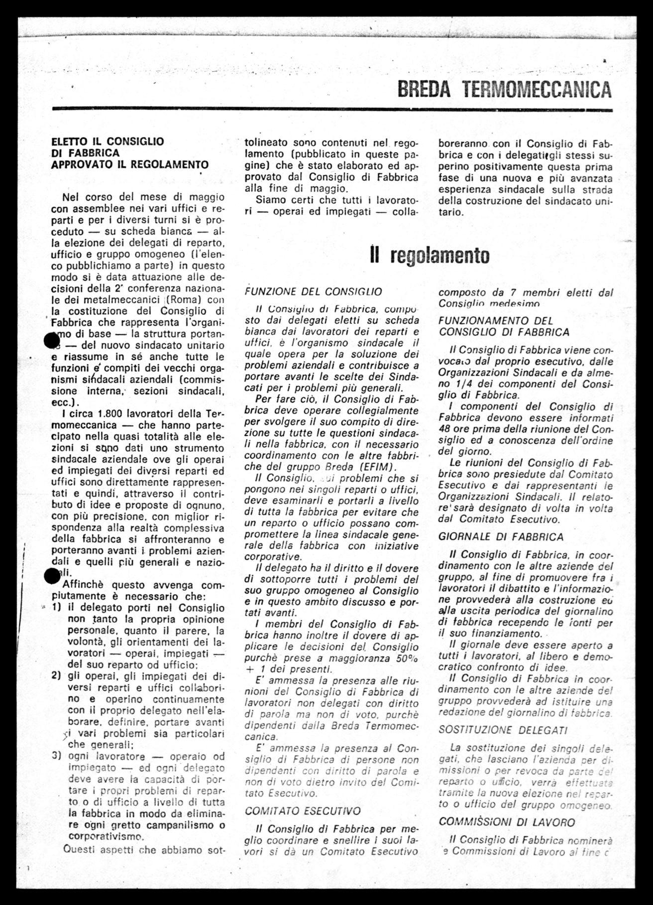 riconoscimento del Consiglio di Fabbrica con tutti i suoi delegati e le necessarie condizioni per svolgere la propria attività costituisce uno degli elementi indispensabili per lo sviluppo della democrazia sindacale e la partecipazione dei lavoratori alle scelte ed alla vita sindacale, per questo è uno dei punti rivendicativi, unitamente alla sede sindacale previsto dallo statuto dei diritti dei lavoratori.