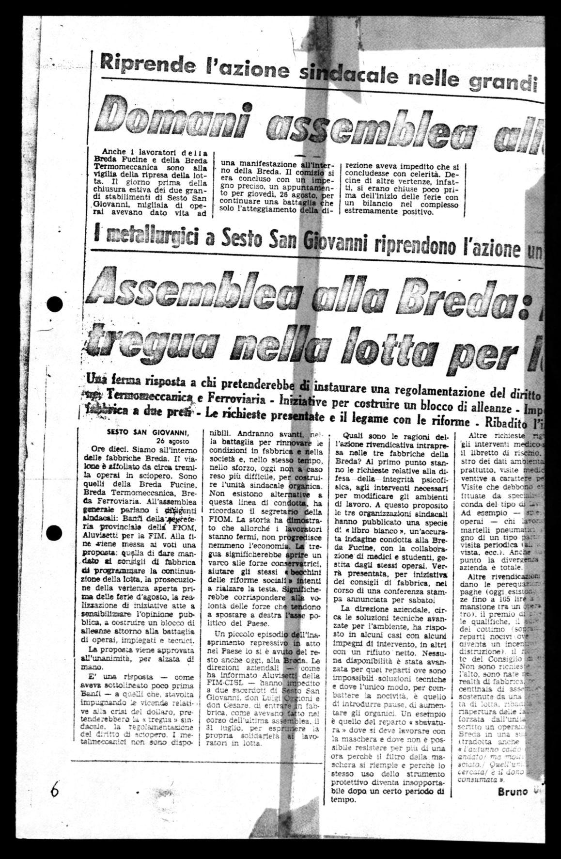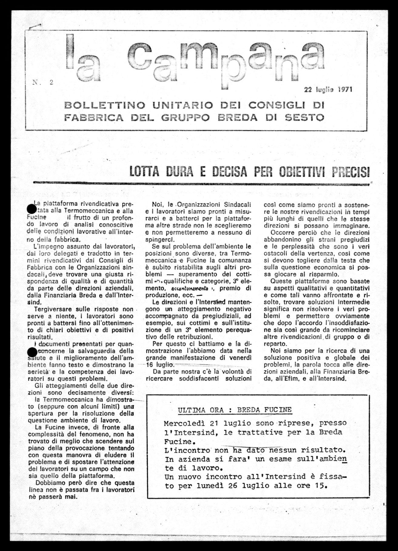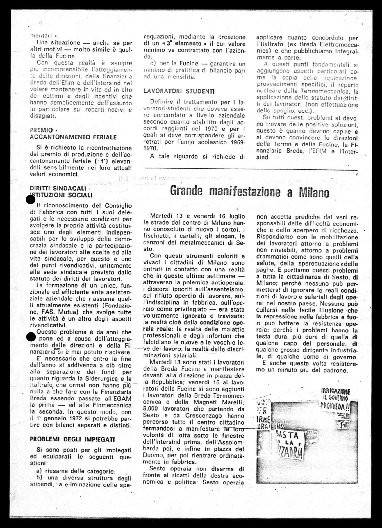 Martedì 13 sono stati i lavoratori della Breda Fucine a manifestare davanti alla direzione in piazza della Repubblica; venerdì 16 ai lavoratori della Fucine si sono aggiunti i lavoratori della Breda Termomecconica e della Magneti Marelli; 6.000 lavoratori che partendo da Sesto e da Crescenzago hanno percorso tutto il centro cittadino fermandosi a manifestare la turo volontà di lotta sotto le finestre dell'Intersind prima, dell'Assolombarda poi, e infine in piazza del Duomo, per poi rientrare ordinatamente in fabbrica.
