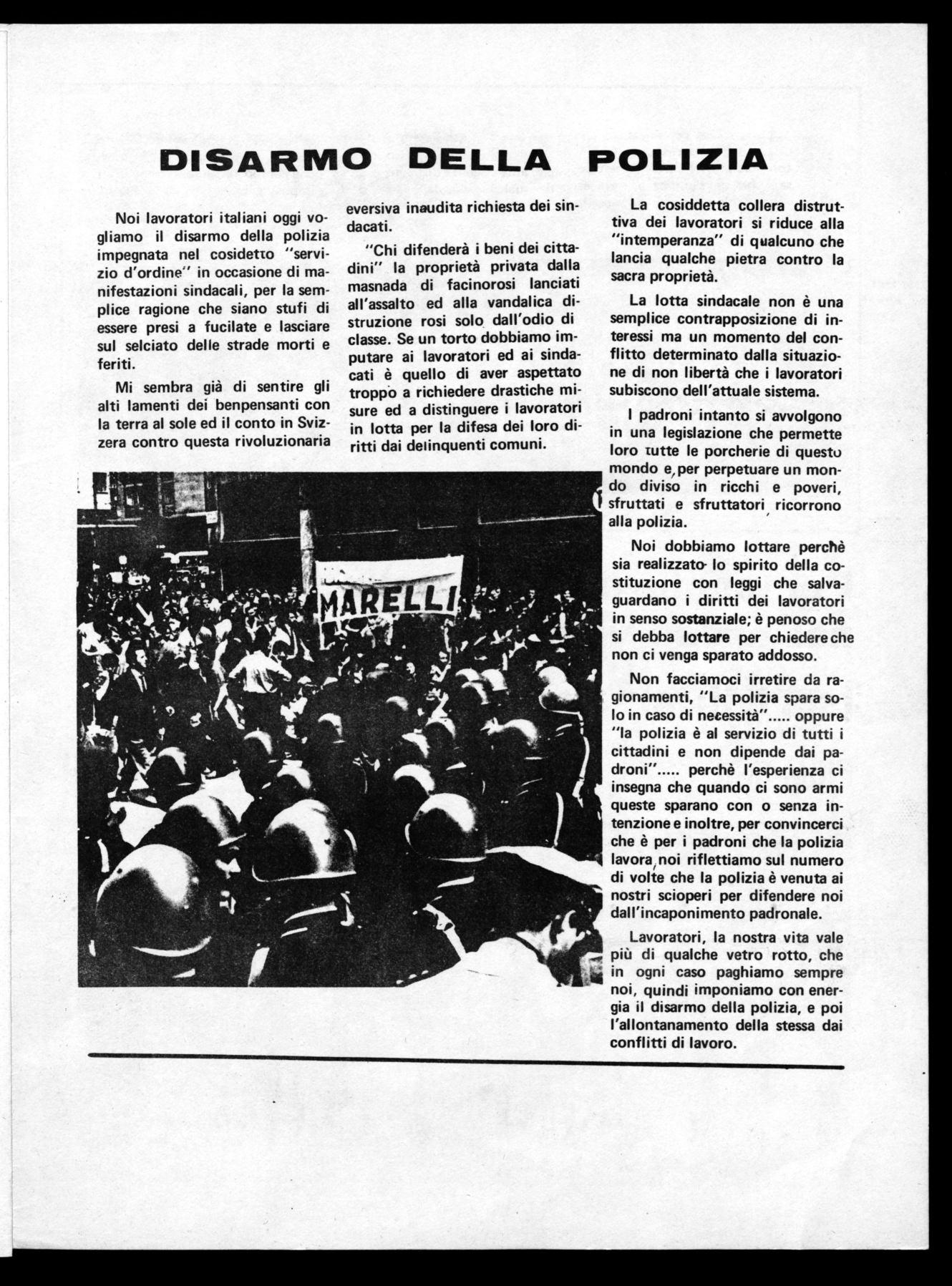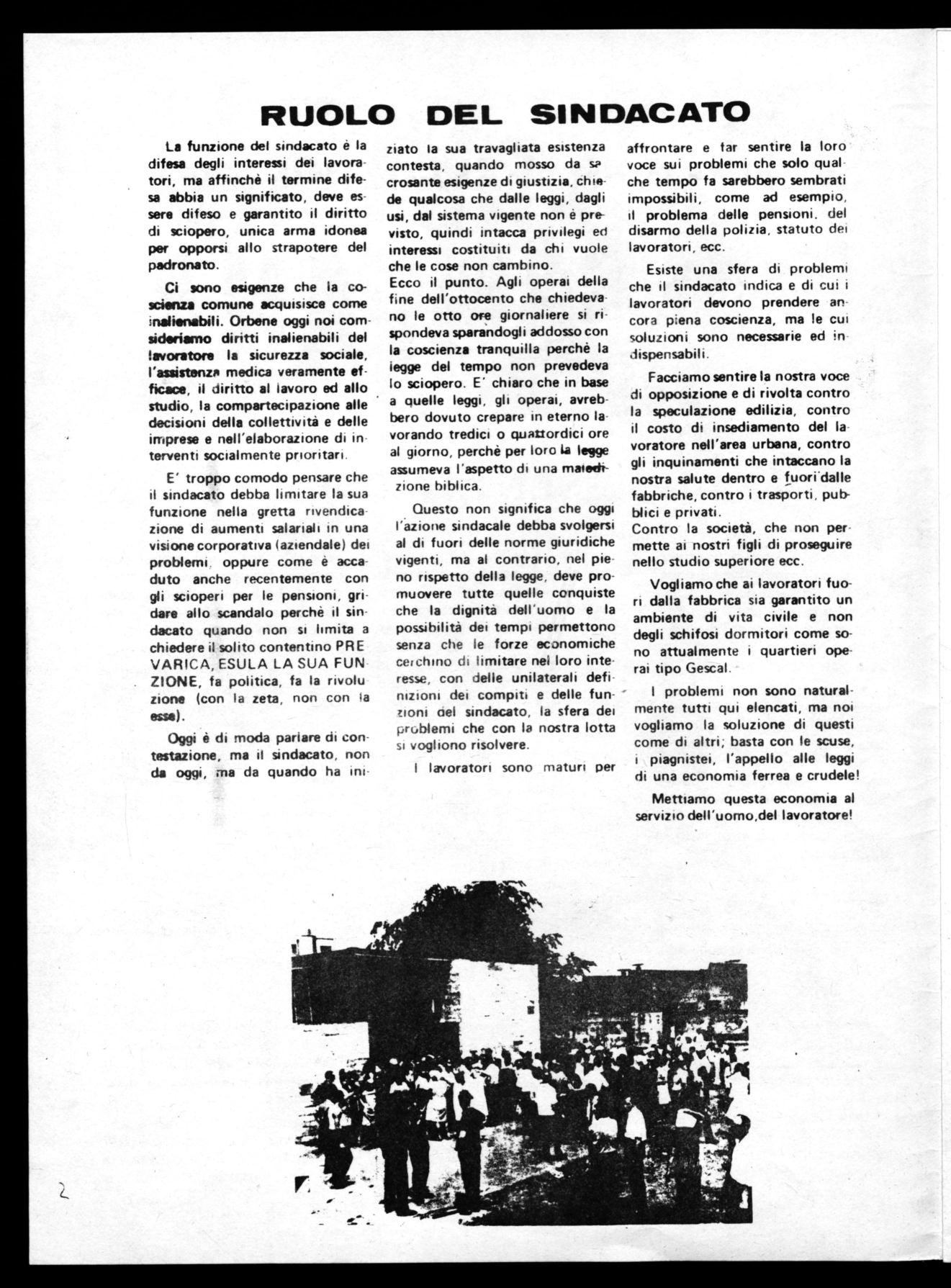 ampia discussione dentro r fuori la fabbrica, dei problemi che travagliano il mondo del lavoro, aiuterebbero a modificare radicalmente certe prese di posizione di chi ha dei preconcetti sulla validità o meno dello sciopero e servirebbero a far conoscere ed a rendere partecipe delle nostre battaglie l'opinione pubblica. In una società qual'è la nostra, lo sciopero garantito dalla costituzione è indispensabile, per migliorare le condizioni di vita e di lavoro; i benefici economici o normativi che si conquistano, non servono solo per i diretti interessati, ma si riversano su tutti i cittadini /esclusi i padroni, questo sia chiaro) e quindi danno impulso alla vita economica e sociale del paese.