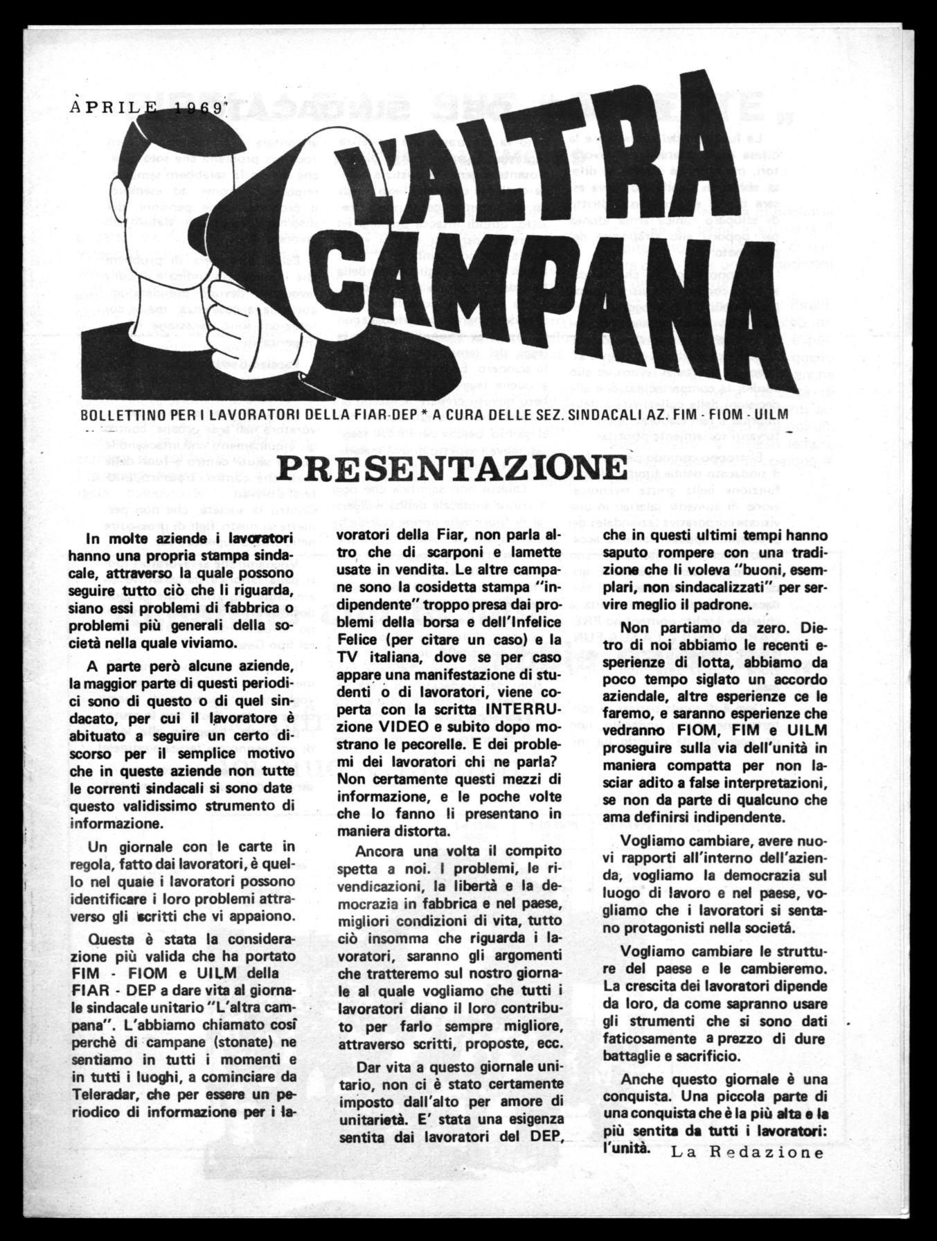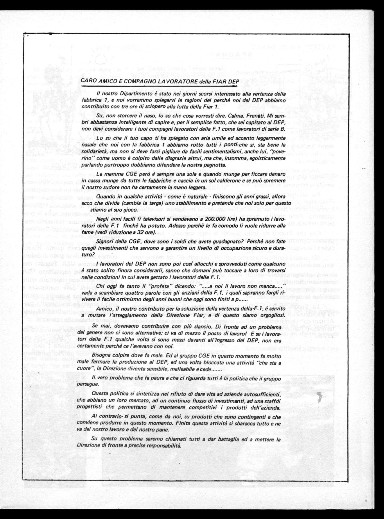 Il nostro Dipartimento è stato nei giorni scorsi interessato alla vertenza della fabbrica 1, e noi vorremmo spiegarvi le ragioni del perchè noi del DEP abbiamo contribuito con tre ore di sciopero alla lotta della Fiar 1.