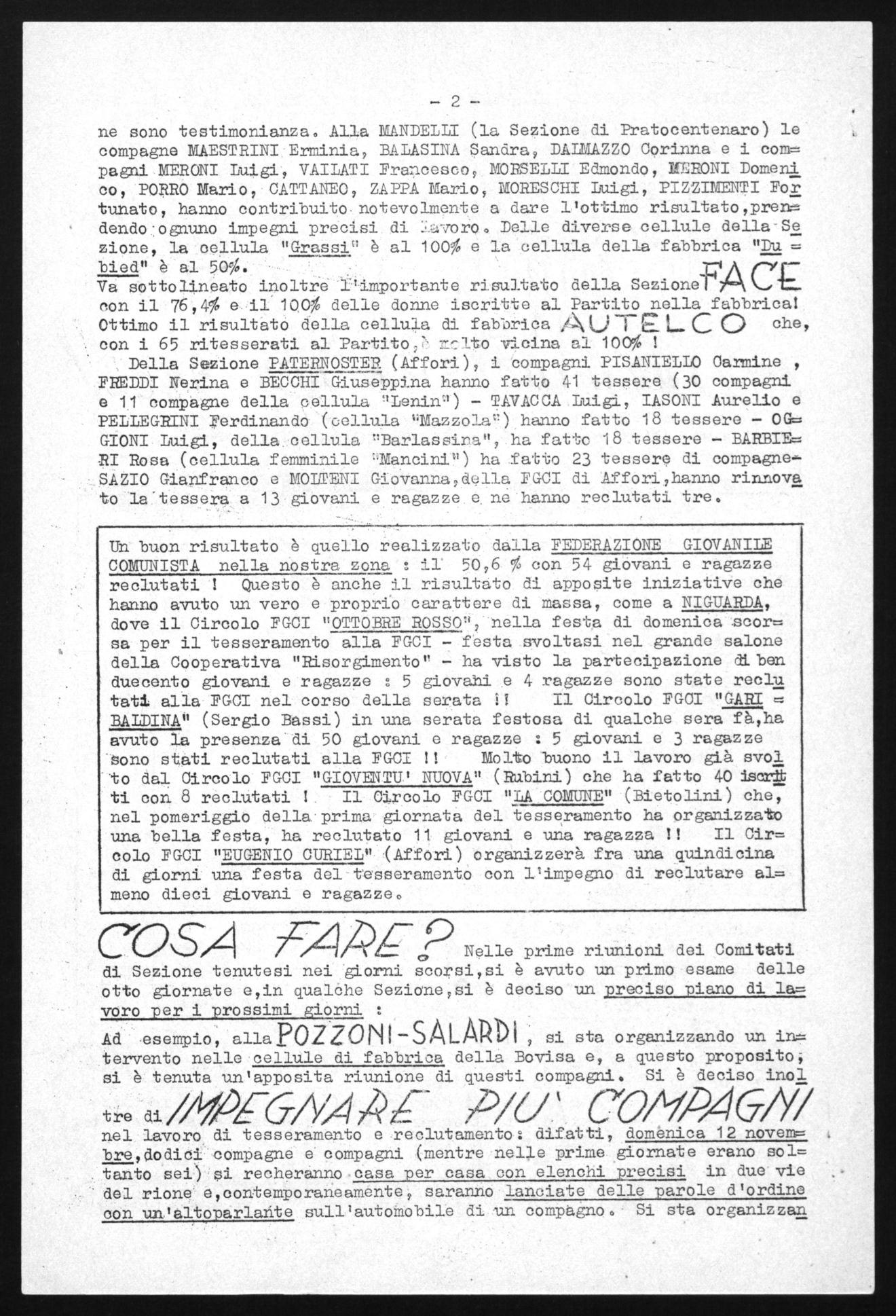 Va sottolineato inoltrè-rimportante risultato della Sezione non il 76,4% e il 100$ delle donne iscritte al Partito nella fabbrica! Ottimo il risultato della cellula dì fabbrica AuT2 L C O che , . con i 65 ritesserati al Partito; =lto vicina al 100% !
