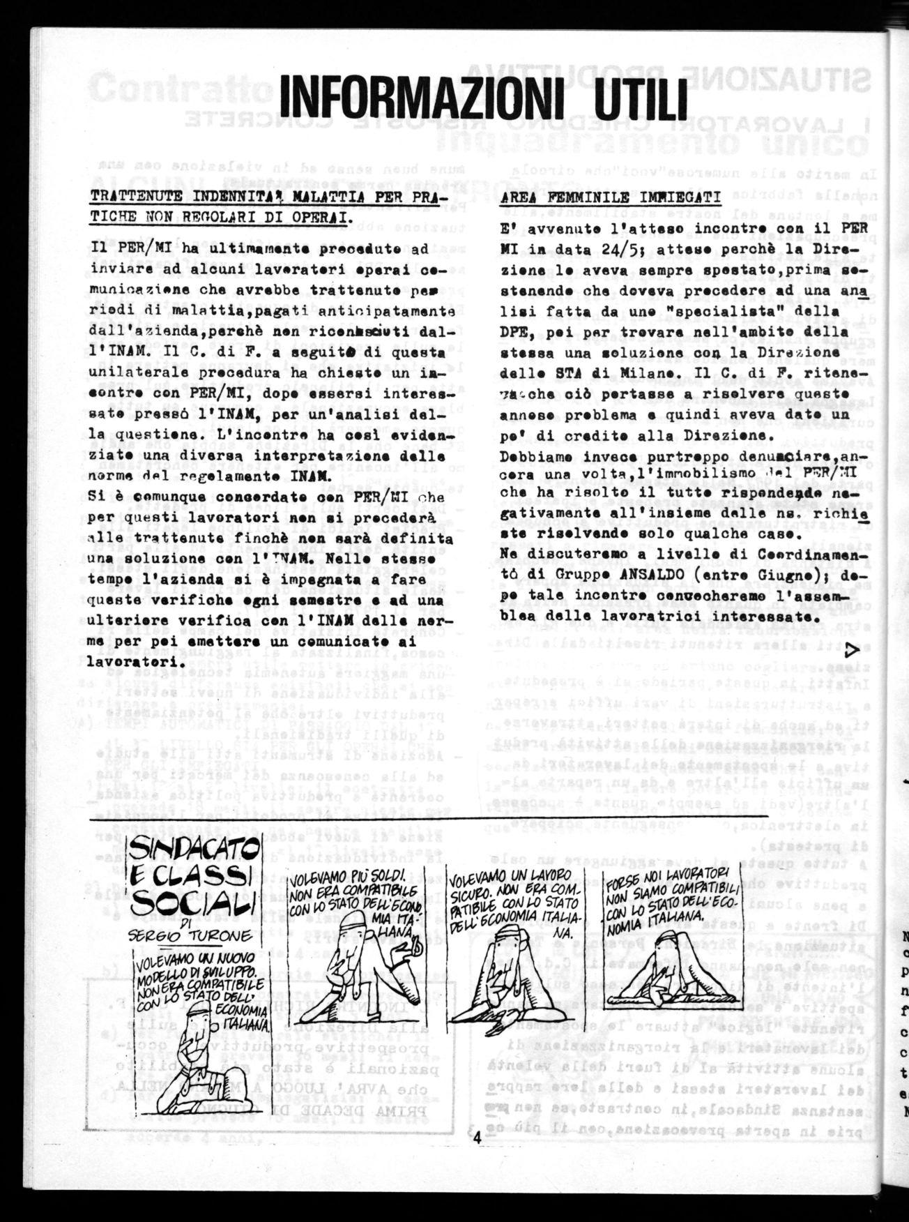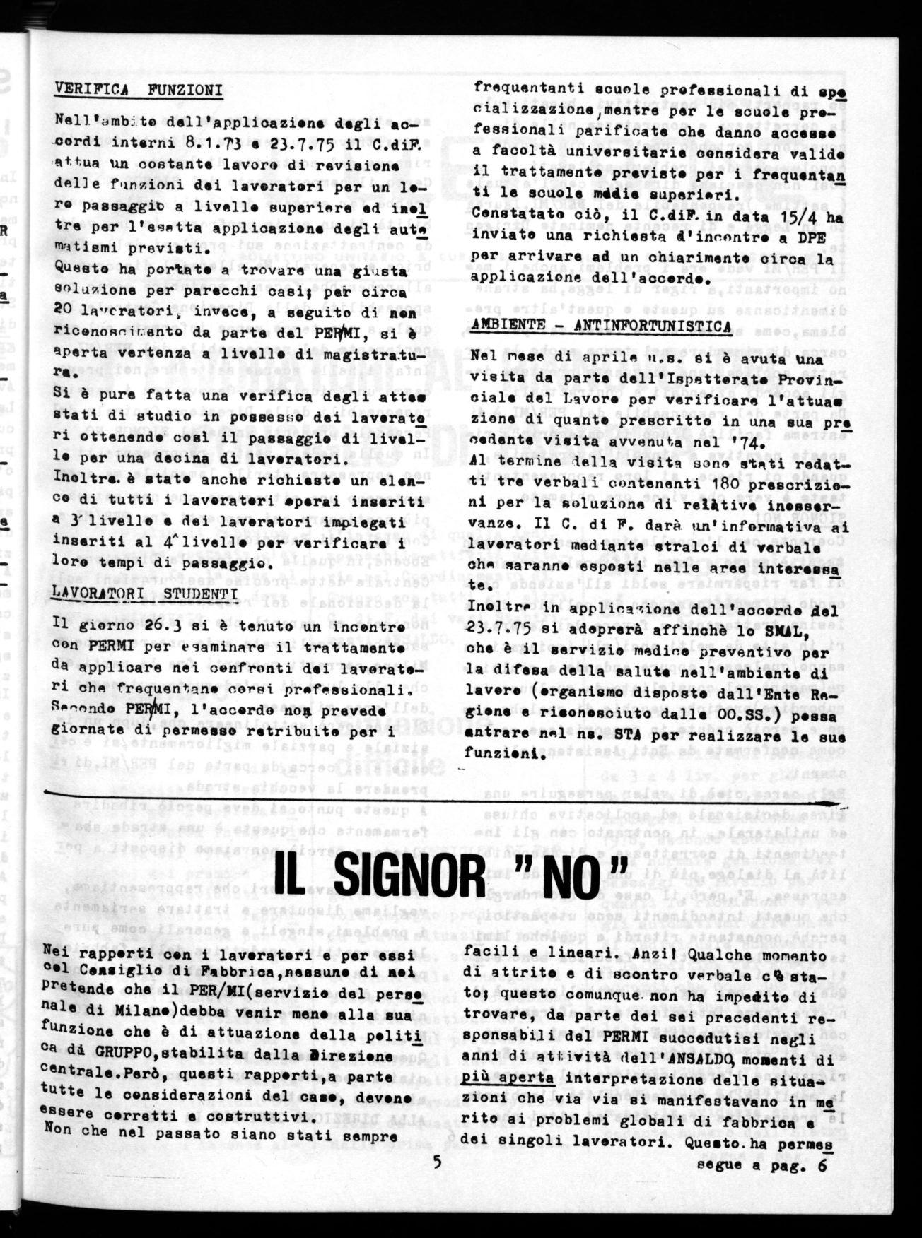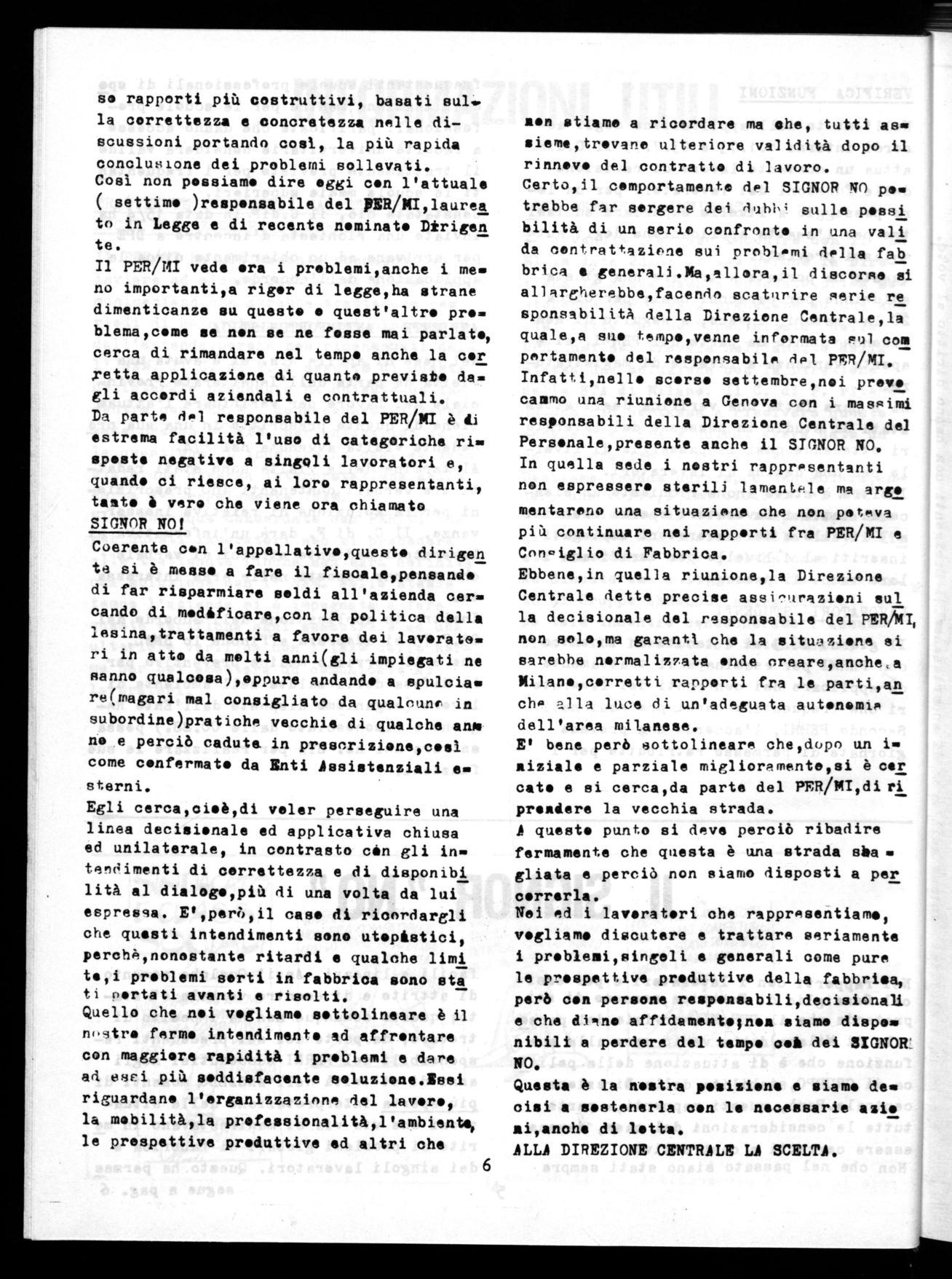 Certo,il comportamento del SIGNOR NO ps. trebbe far sorgere dei aubh; sulle passi bilità di un serio confronto in una vali da contrattazione sui problemi della fab brica e generali.Ma,alloranl discorso si allargberebbe,facendo scaturire serie re sponsabilitA della Direzione Centrale,la quale,a suo tempo,venne informata mul cos portamento del responsabile del PER/mi. Infatti,nelle scorse settembre,noi provo caamo una riunione a Genova con i massimi responsabili della Direzione Centrale del Persenale,presente anche il SIGNOR NO. In quella sede i nostri rappresentanti non espressero sterili lamenté,le ma ere mentareno una situazione che non poteva più continuare nei rapporti fra PER/MI e Coniglio di Fabbrica.