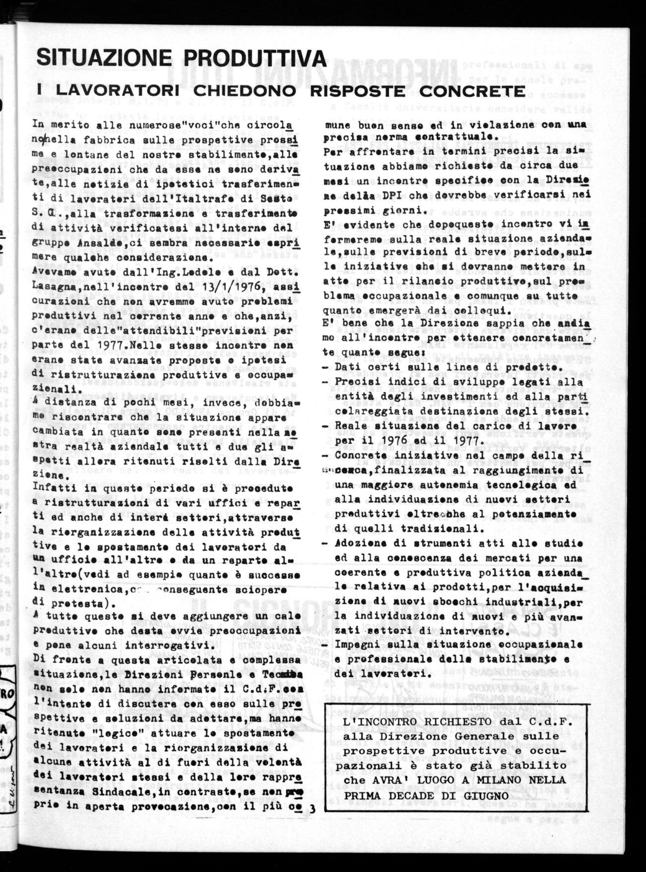 Avevamo avuto dall'Ing.Lodolo e dal Dott. Lasagna,nell'incontro del 13/1/1976, assi curazioni che non avremmo avuto problemi produttivi nel corrente anno e che,anzi, c'erano delle"attendibili"previaioni per parte del 1977.Nello stesso incontro non erano state avanzate proposte o ipotesi di ristrutturazione produttive e occupa• zionali.