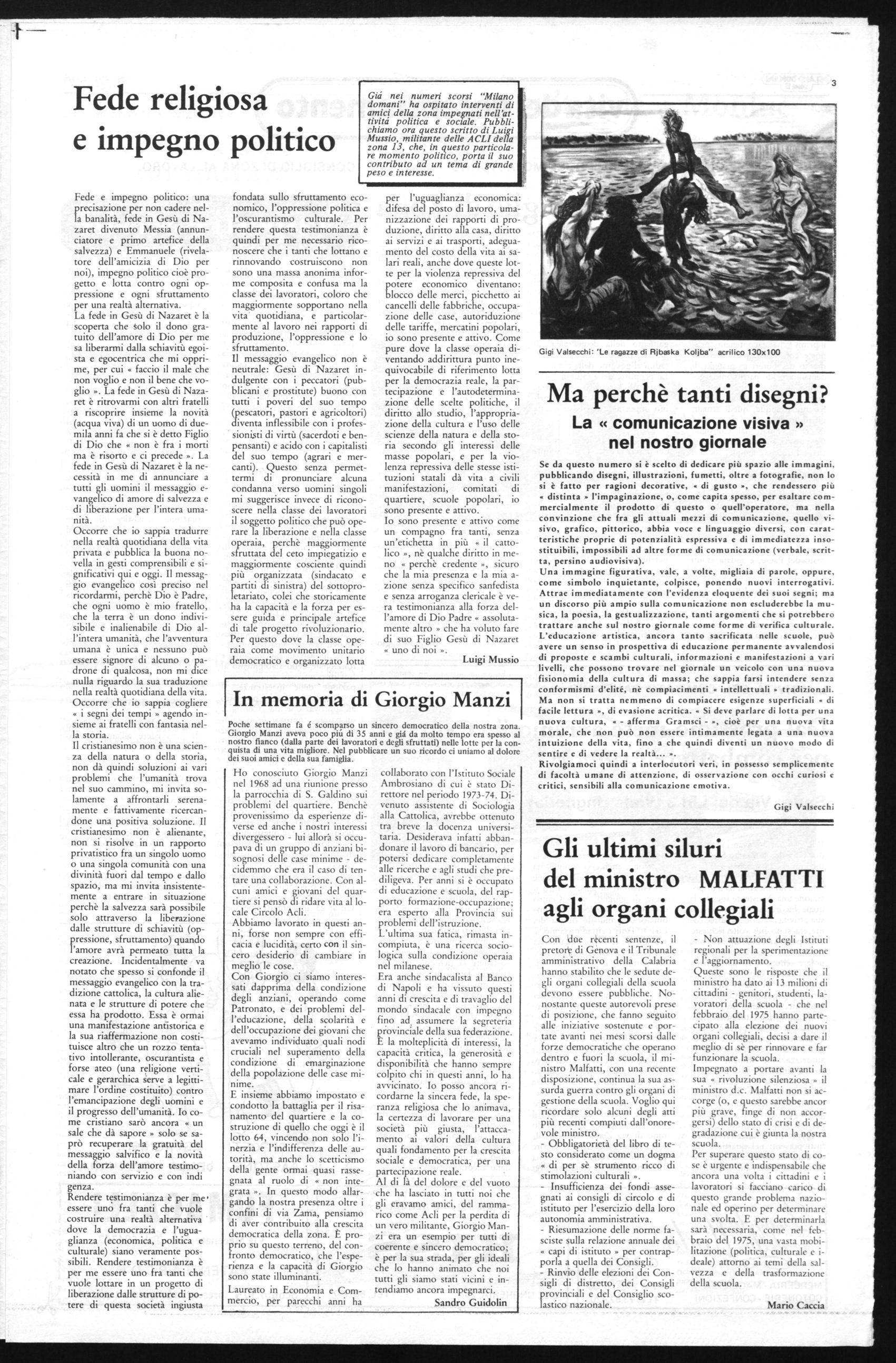 Per esigenza di spazio non ci è possibile riassumere qui gli interventi successivi per lo più caratterizzati da un profondo sforzo culturale teso a condannareconvalidi argomenti il fenomeno dell'integralismo religioso. Una scuola come servizio sociale, -senza valori ideologici da trasmettere dall'alto ma aperta al confronto e fondata sul pieno rispetto della personalità dello scolaro (partendo anche dalla scuola materna, ha aggiunto Zagato): questo in sintesi il significato di fondo degli interventi che hanno dato significato all'assemblea. Segue infine una breve replica dei relatori. In trasparente polemica con il confuso intervento del rappresentante di Comunione e Liberazione, Sauro Tiberi chiarisce come una corretta definizione di pluralismo si fondi sul confronto tra diversi per costituire momenti di unificazione e non per conservare ad ogni costo le diversità. Si conclude così l'assemblea. Un'esperienza che non deve restare isolata, ha affermato De Biasi, coordinatore della Commissione scuola del Consiglio di Zona, ma che deve stimolare un rapporto sempre più stretto tra istituzioni e realtà sociale.