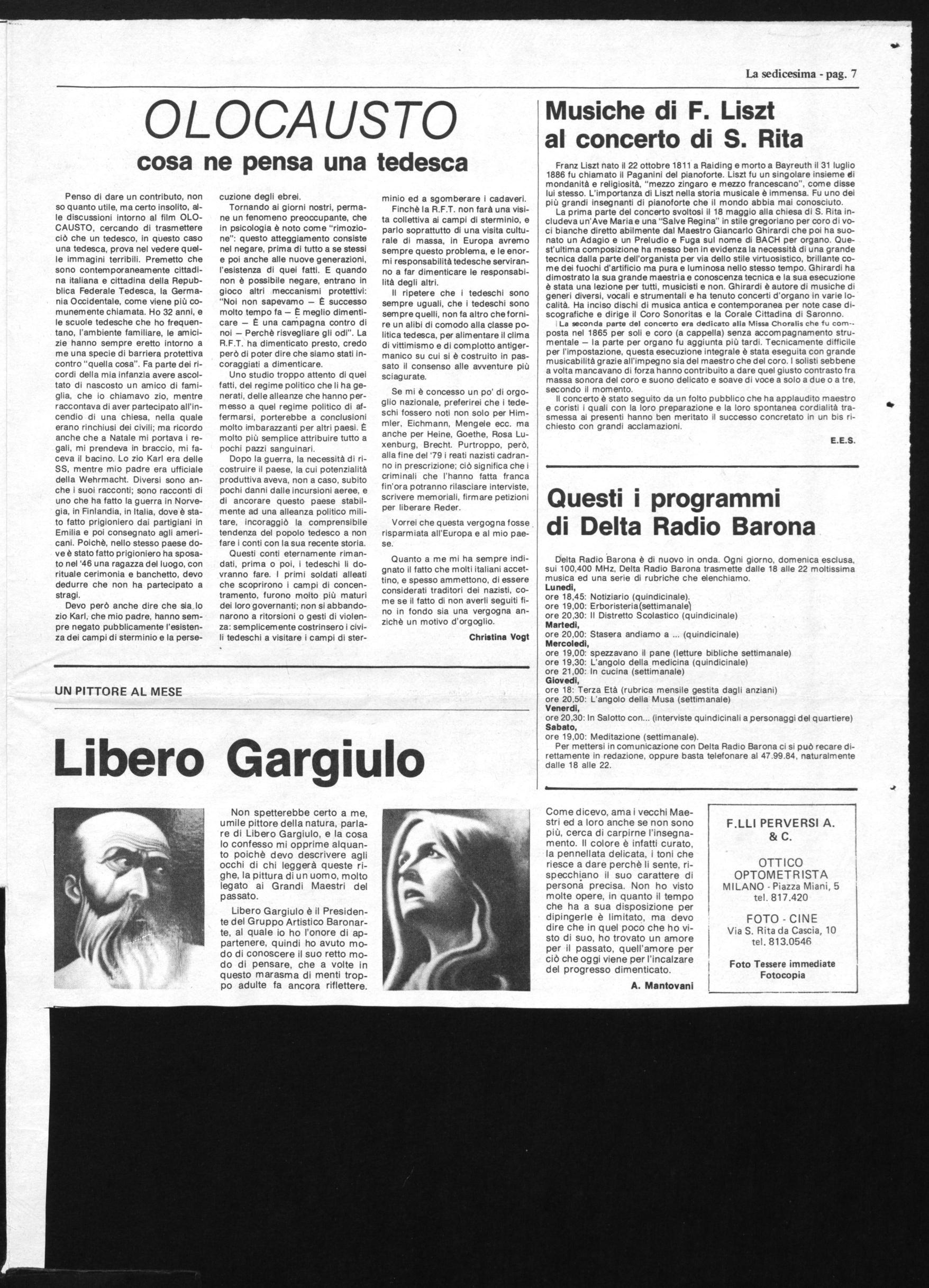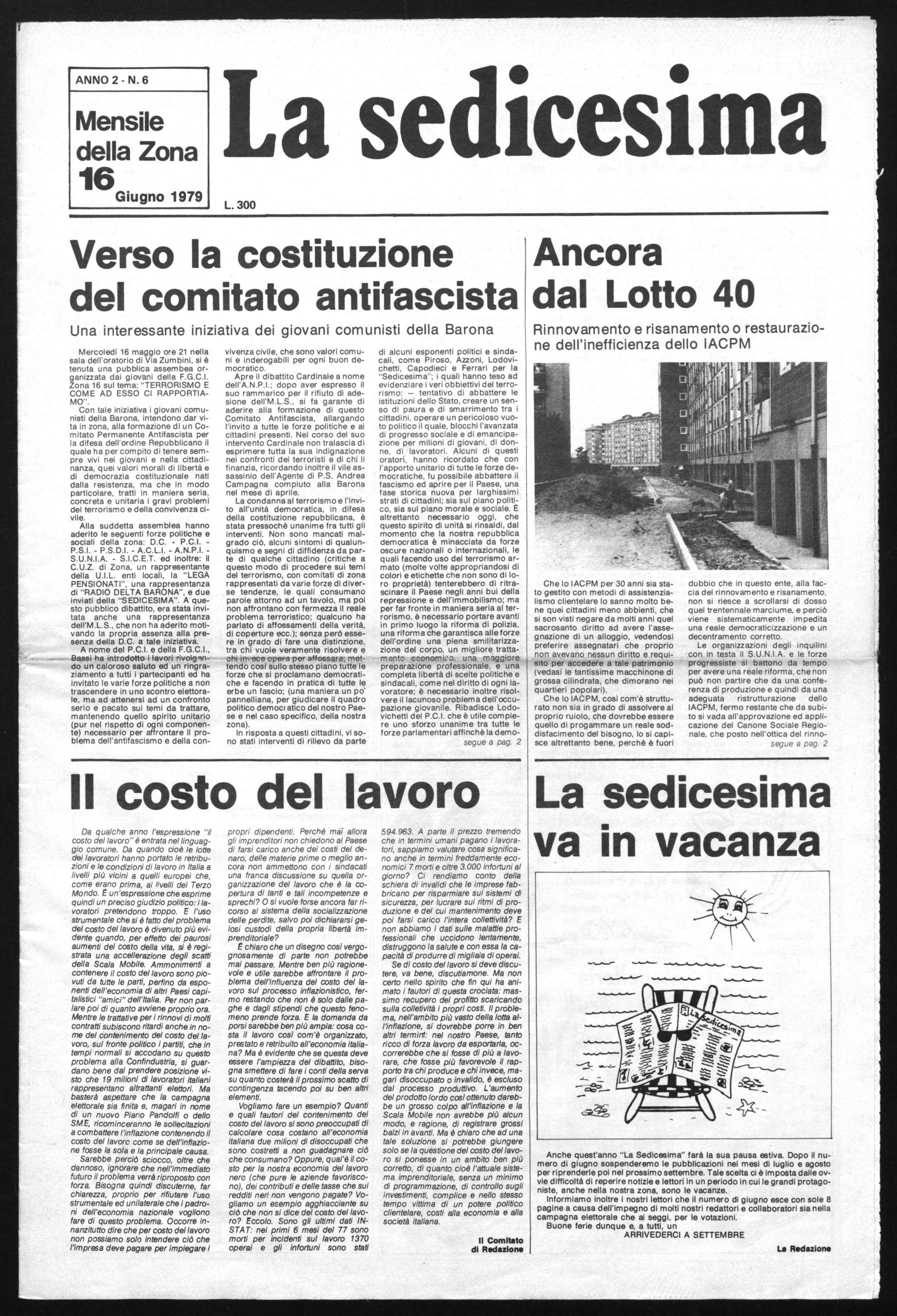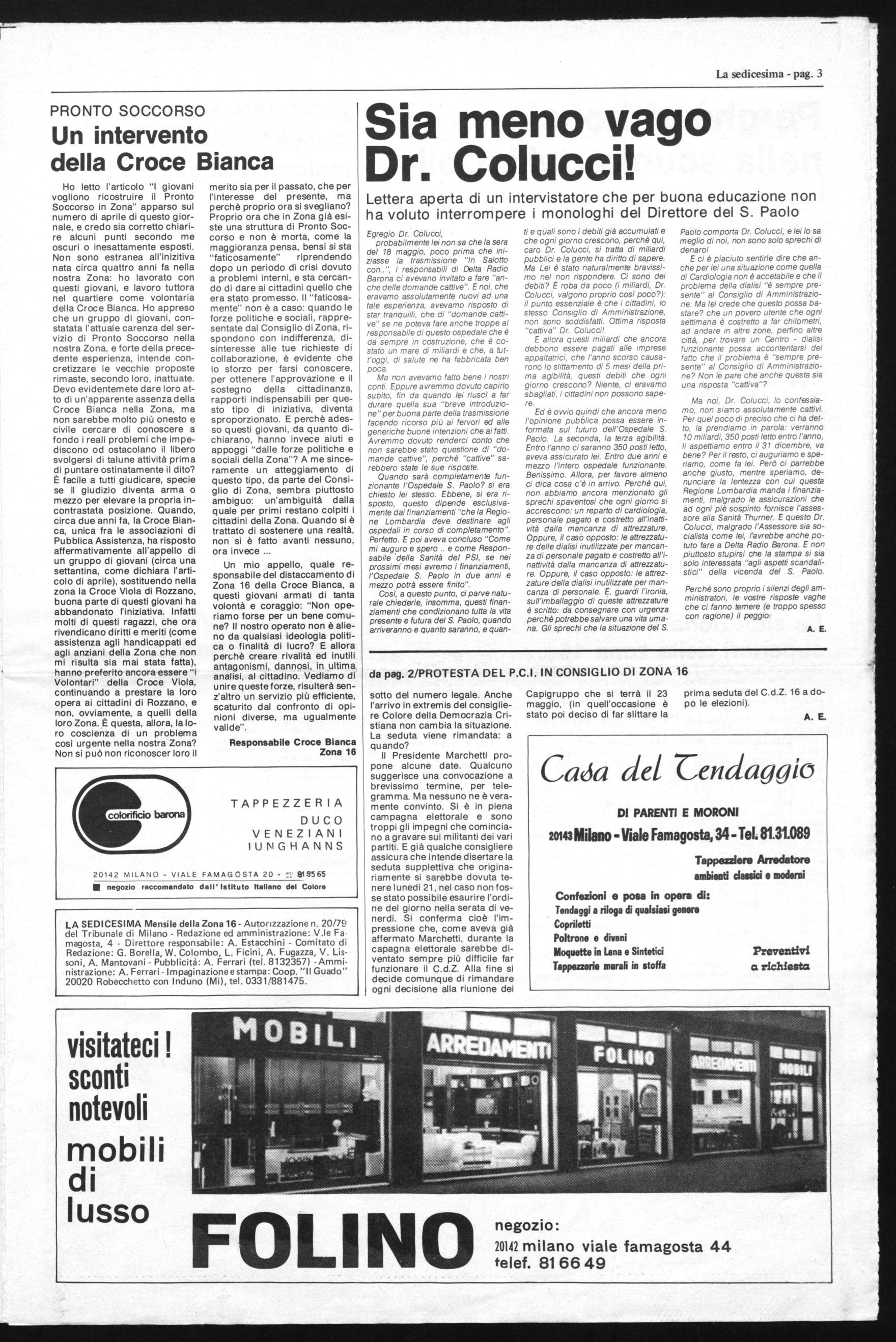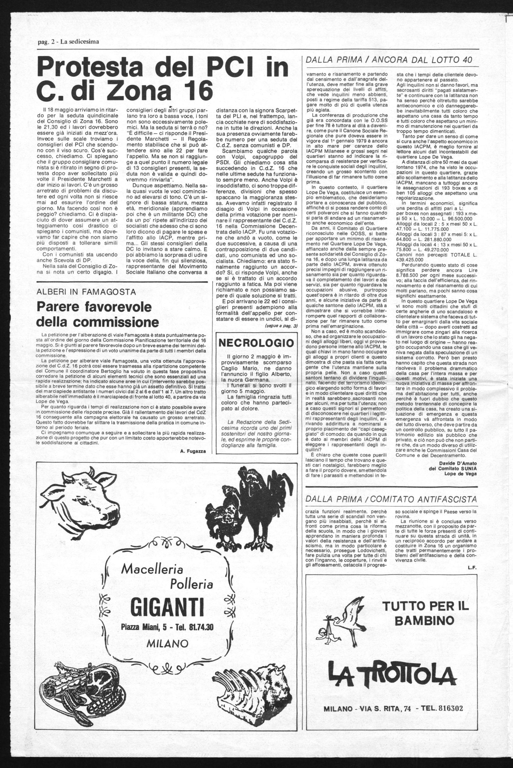 LA SEDICESIMA Mensile della Zona 16- Autorizzazione n. 20/79 del Tribunale di Milano - Redazione ed amministrazione: V.le Fa magosta, 4 - Direttore responsabile: A. Estacchini - Comitato di Redazione: G. Borella, W. Colombo, L. Ficini, A. Fugazza, V. Lissoni, A. Mantovani - Pubblicità: A. Ferrari (tel. 8132357) -Amministrazione: A. Ferrari - Impaginazione e stampa: Coop. "Il Guado" 20020 Robecchetto con Induno (Mi), tel. 0331/881475. Zu,