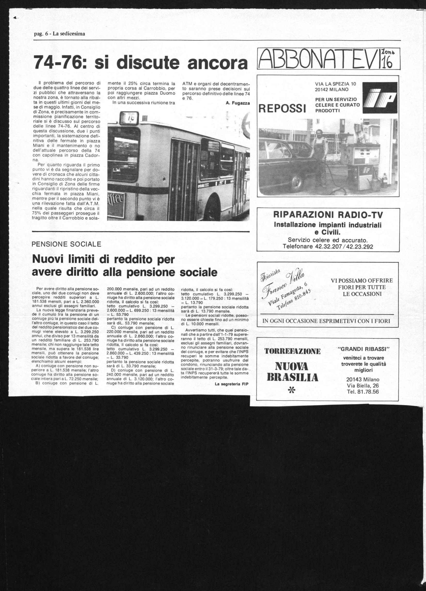 Il problema del percorso di due delle quattro linee dei servizi pubblici che attraversano la nostra zona, è tornato alla ribalta in questi ultimi giorni del mesedi maggio. Infatti, in Consiglio di Zona, e precisamente in commissione pianificazione territoriale si è discusso sul percorso delle linee 74-76. Al centro di questa discussione, due i punti importanti, la sistemazione definitiva delle fermate in piazza Miani e il mantenimento o no dell'attuale percorso della 74 con capolinea in piazza Cadorna. Per quanto riguarda il primo punto vi è da segnalare per dovere di cronaca che alcuni cittadini hanno raccolto e poi portato in Consiglio di Zona delle firme riguardanti il ripristino della vecchia fermata in piazza Miani, mentre per il secondo punto vi è una rilevazione fatta dall'A.T.M. nella quale risulta che circa il 75% dei passeggeri prosegue il tragitto oltre il Carrobbio e sola-