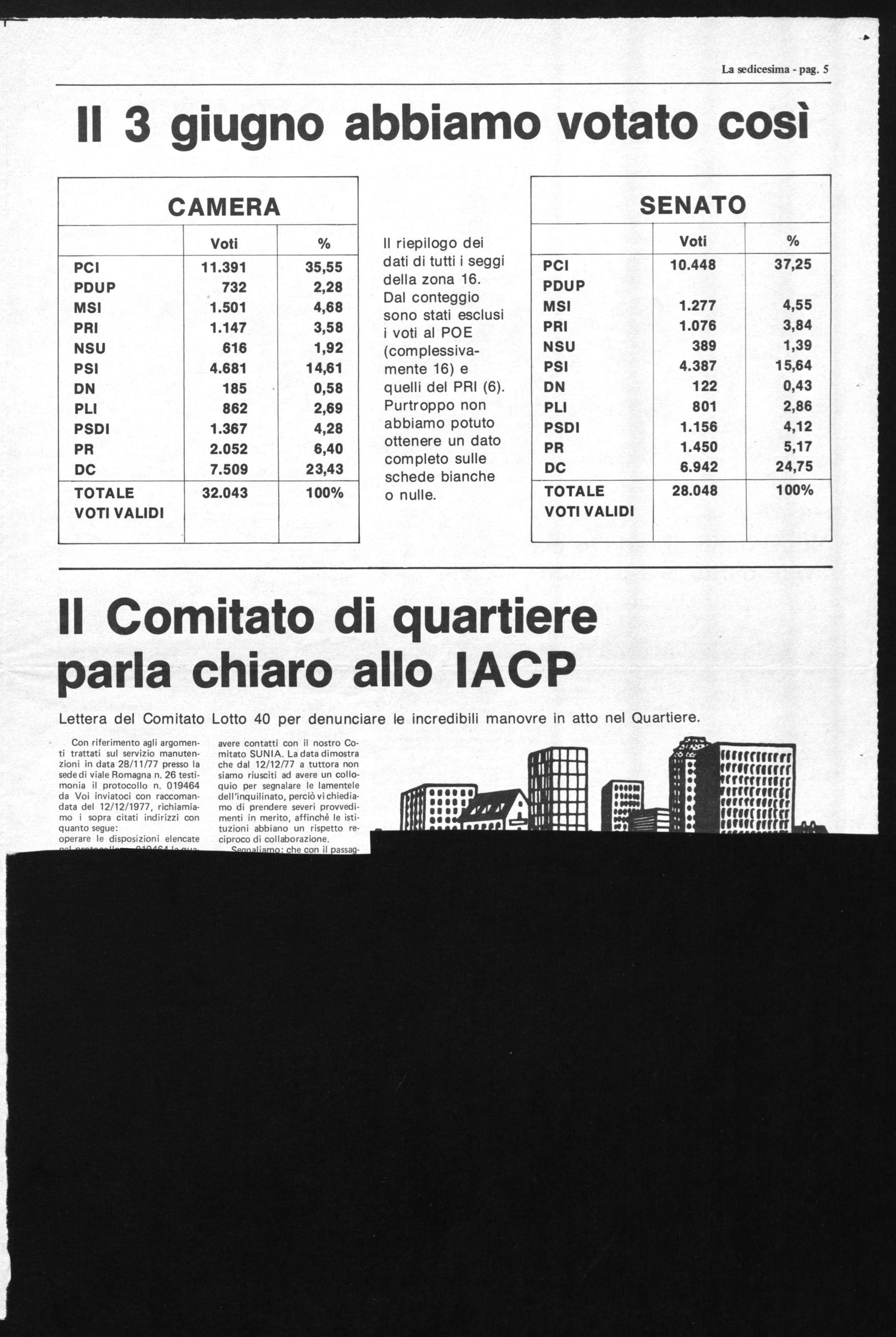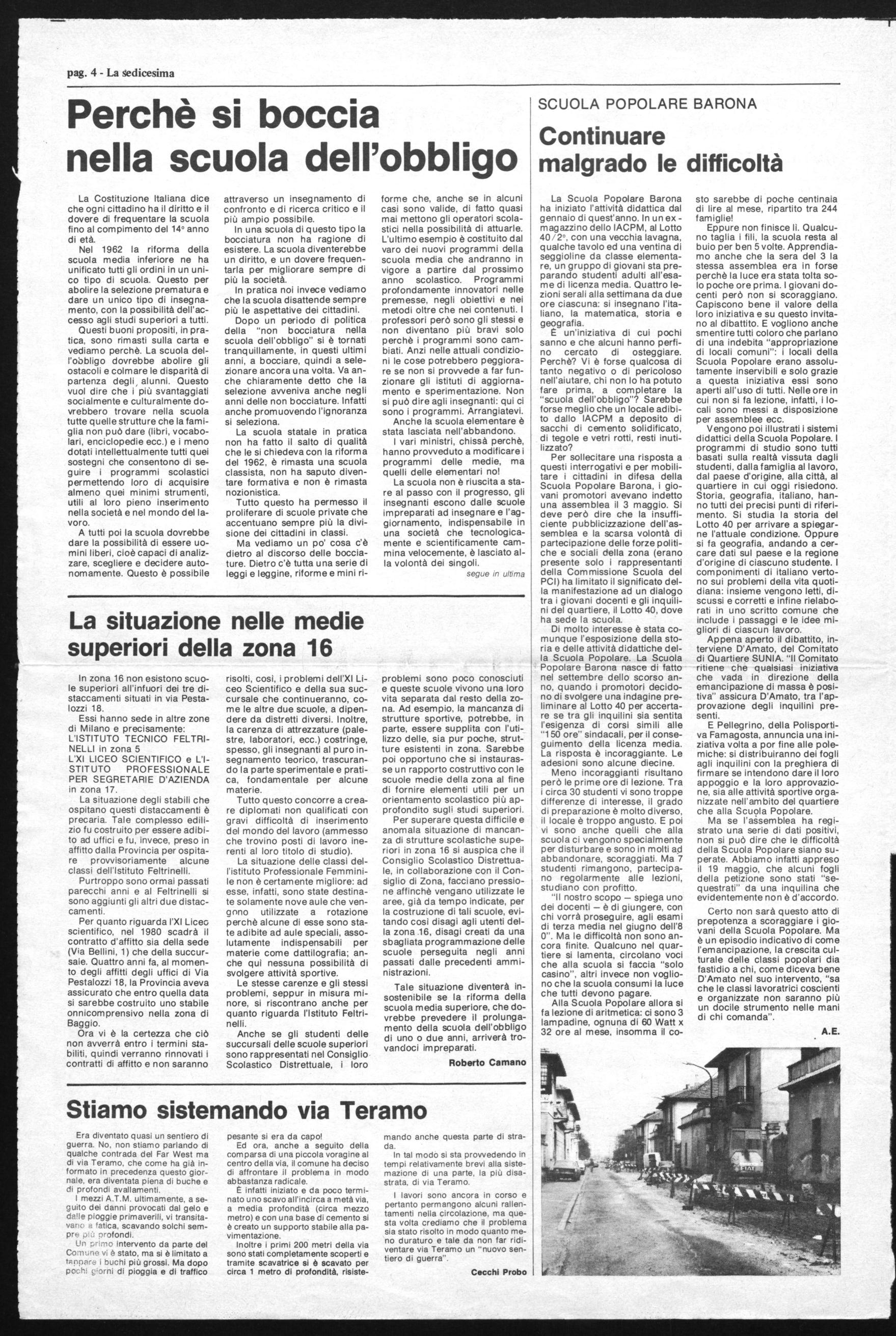 Il 18 maggio arriviamo in ritardo per la seduta quindicinale del Consiglio di Zona 16. Sono le 21,30 ed i lavori dovrebbero essere già iniziati da mezz'ora. Invece sulle scale troviamo i consiglieri del PCI che scendono con il viso scuro. Cos'è successo, chiediamo. Ci spiegano che il gruppo consigliare comunista si è ritirato in segno di protesta dopo aver sollecitato più volte il Presidente Marchetti a dar inizio ai lavori. C'è un grosso arretrato di problemi da discutere ed ogni volta non si riesce mai ad esaurire l'ordine del giorno. Ma facendo così non è peggio? chiediamo. Ci è dispiaciuto di dover assumere un atteggiamento così drastico ci spiegano i comunisti, ma dovevamo far capire che non siamo più disposti a tollerare simili comportamenti. Con i comunisti sta uscendo anche Scevola di DP.