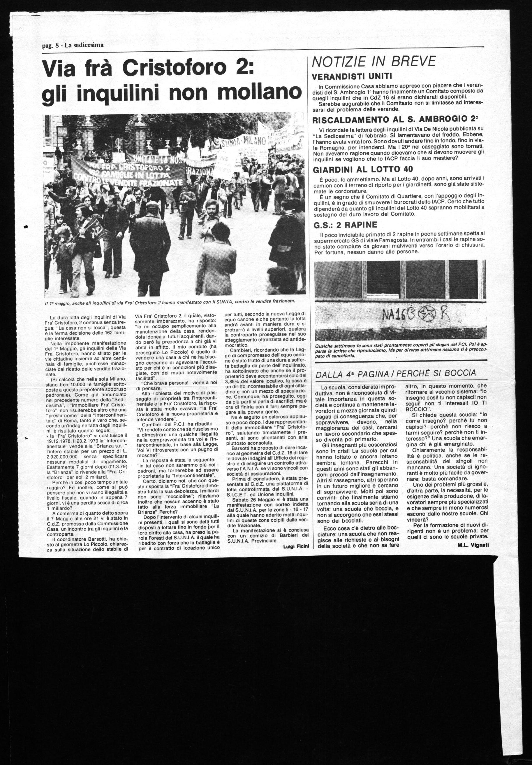 Prima di concludere, è stata presentata al C.d.Z. una piattaforma di lotta controfirmata dal S.U.N.I.A.S.I.C.E.T. ed Unione Inquilini. Sabato 26 Maggio vi è stata una manifestazione con corteo indetta dal S.U.N.I.A. per le zone 5 - 16 - 17 alla quale hanno aderito molti inquilini di queste zone colpiti dalle vendite frazionate. La manifestazione si è conclusa con un comizio di Barbieri del S.U.N.I.A. Provinciale.