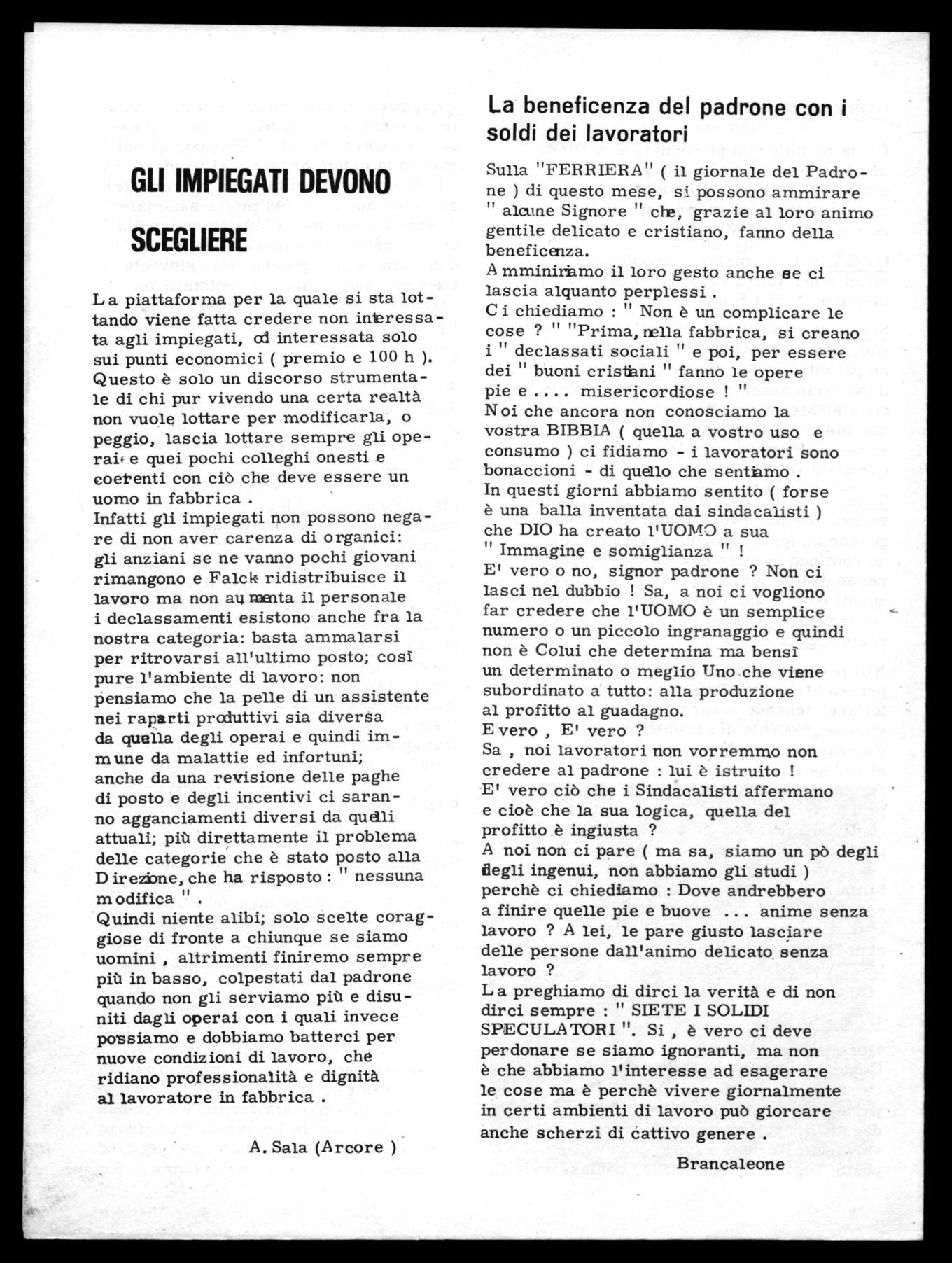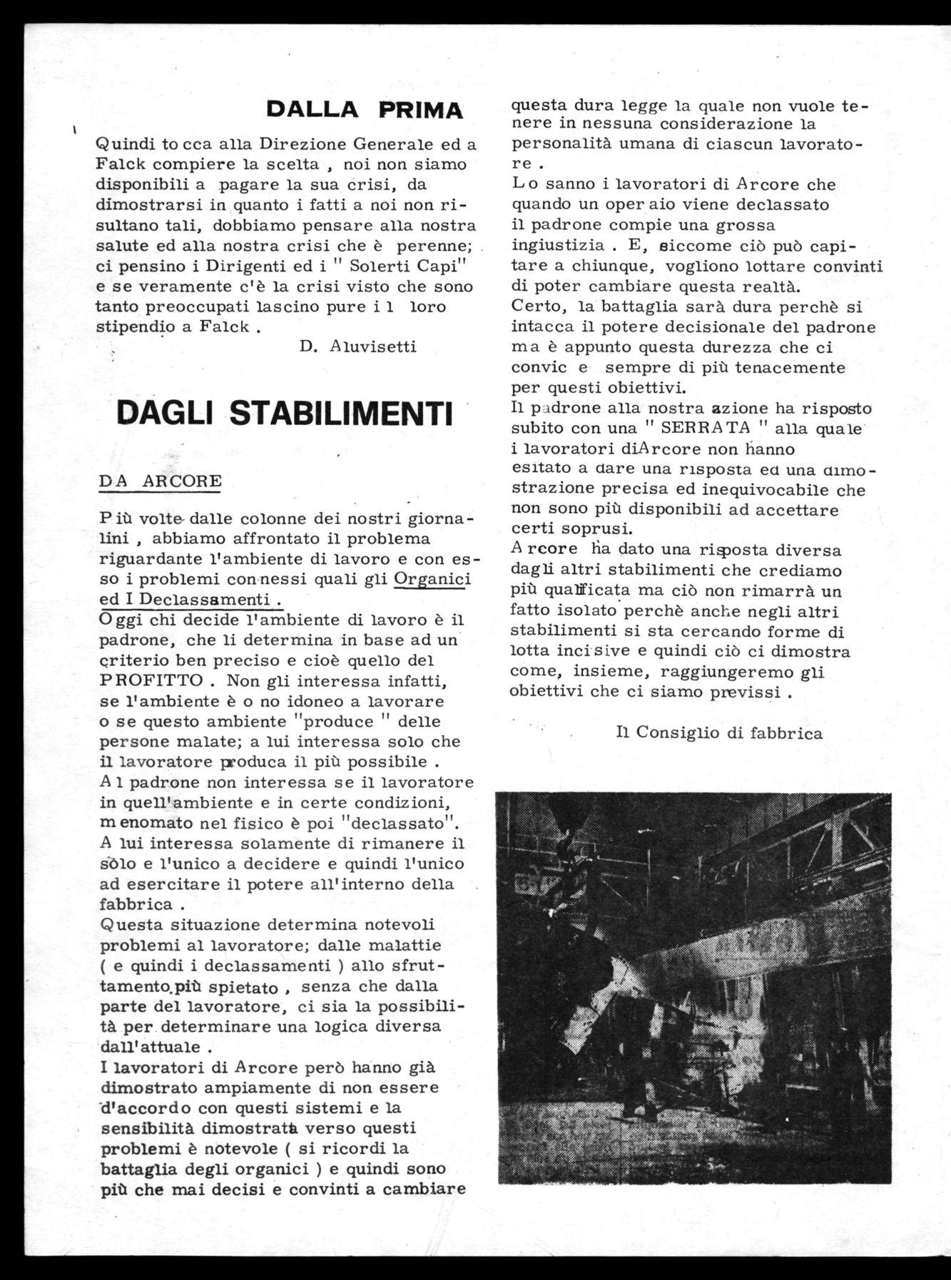 Questa è la dimostrazione che Falck non ha più elementi validi per respingere le richieste dei lavoratori, in quanto esse tendono a ridare dignità ed umanità al lavoro, sottraendo al padrone ed ai suoi "Galoppini " quegli strumenti di sfruttamento che gli danno potere in fabbrica e nel paese .