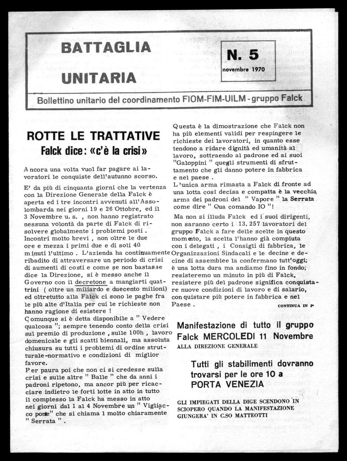 E' da più di cinquanta giorni che la vertenza con la Direzione Generale della Falck è aperta ed i tre incontri avvenuti all'Assolombarda nei giorni 19 e 26 Ottobre, ed il 3 Novembre u. s. , non hanno registrato nessuna volontà da parte di Falck di risolvere globalmente i problemi posti . Incontri molto brevi , non oltre le due ore e mezza i primi due e di soli 40