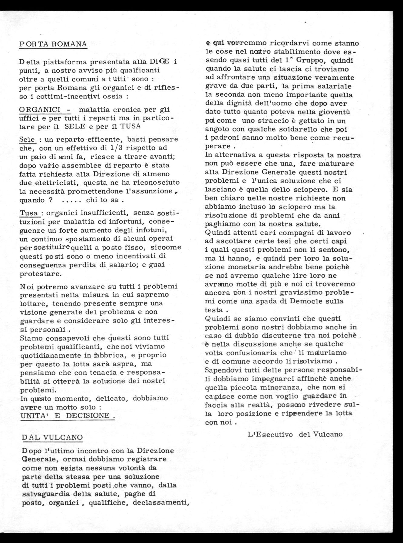 Siamo consapevoli che questi sono tutti problemi qualificanti, che noi viviamo quotidianamente in fabbrica, e proprio per questo 1a lotta sarà aspra, ma pensiamo che con tenacia e responsabilità si otterrà la soluzione dei nostri problemi.