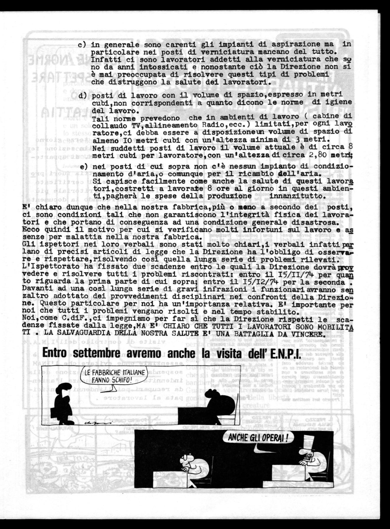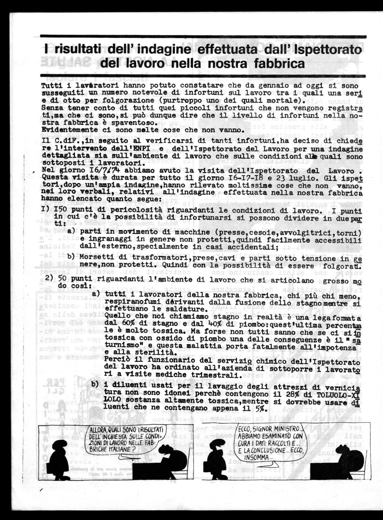 E' chiaro dunque che nella nostra fabbrica,più o meno a secondo dei posti, ci sono condizioni tali che non garantiscono l'integrità fisica dei lavoratori e che portano di conseguenza ad una condizione generale disastrosa. Ecco quindi il motivo per cui si verificano molti infortuni sul lavoro e as senze per malattia nella nostra fabbrica. Gli ispettori nei loro verbali sono stati molto chiari,i verbali infatti par lano di precisi articoli di legge che la Direzione ha l'obbligo di osservai.; re e rispettare,risolvendo così quella lunga serie di problemi rilevati. L'Ispettorato ha fissato due scadenze entro le quali la Direzione dovràprov vedere e risolvere tutti i problemi riscontrati: entro il 15/11/74 per qua to riguarda la prima parte di cui sopra; entro il 15/12/74 per la seconda.: Davanti ad una così lunga serie di gravi infrazioni i funzionari avranno sen zaltro adottato dei provvedimenti disciplinari nei confronti della Direzio: ne. Questo particolare per noi ha un'importanza relativa. E' importante per noi che tutti i problemi vengano risolti e nel tempo stabilito. Noi,come C.diF.,ci impegniamo per far sì che la Direzione rispetti le scadenze fissate dalla legge,MA E' CHIARO CHE TUTTI I LAVORATORI SONO MOBILITA TI . LA SALVAGUARDIA DELLA NOSTRA SALUTE E' UNA BATTAGLIA DA VINCERE.