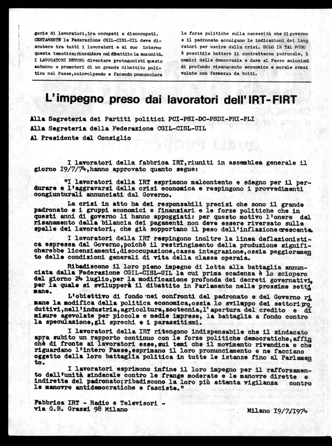 I lavoratori della IRT ritengono indispensabile che il sindacato apra subito un rapporto continuo con le forze politiche democratiche,affía ché di fronte ai lavoratori esse,sui temi che il movimentò rivendica e che riguardano l'intero Paese,esprimano il loro pronunciamento e ne facciano oggetto della loro battaglia politica in tutte le istanze fino al Parlamen to.