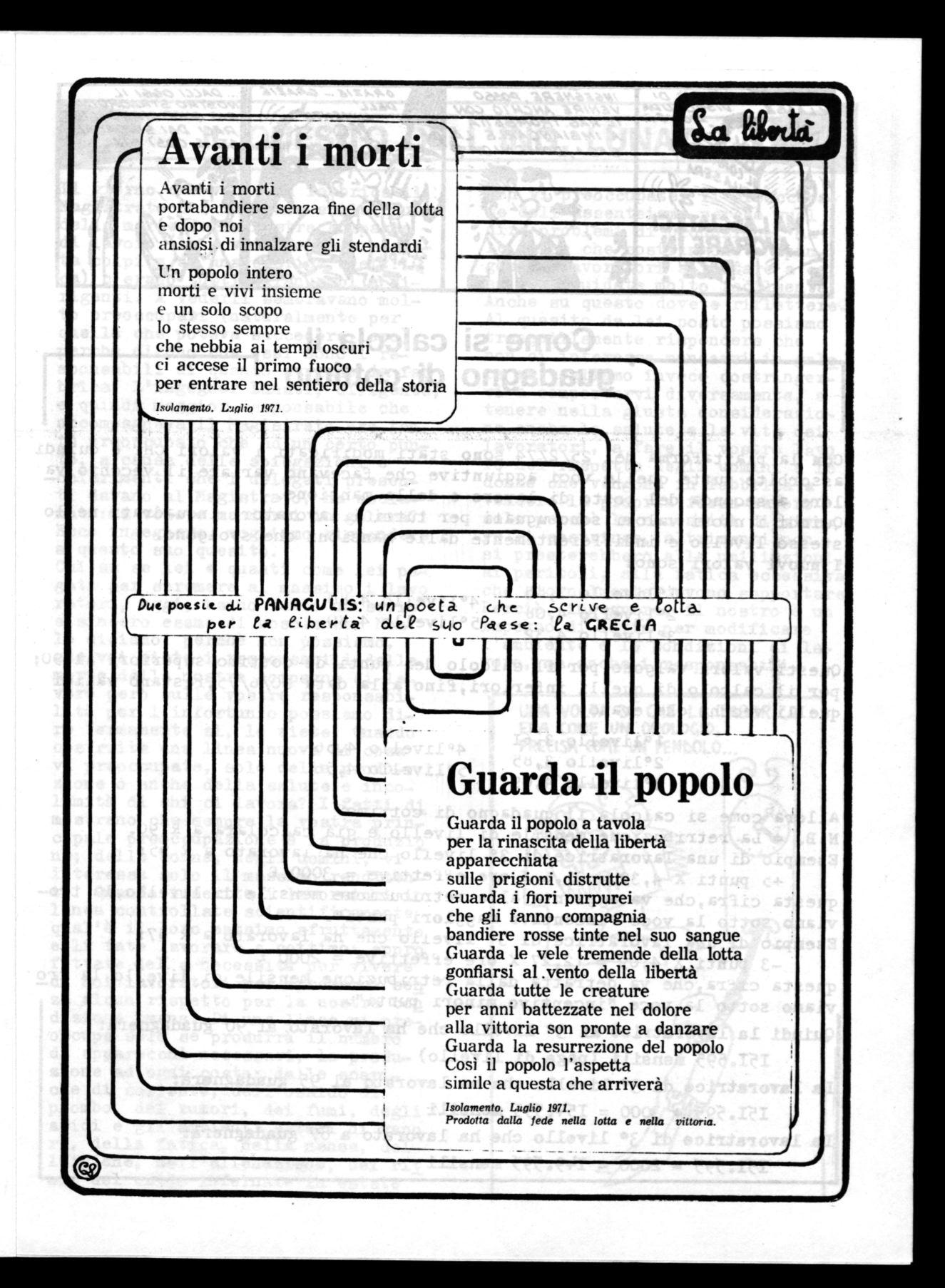 Un popolo intero morti e vivi insieme e un solo scopo lo stesso sempre che nebbia ai tempi oscuri ci accese il primo fuoco per entrare nel sentiero della storia is..1sulamento. Luglio 1971.