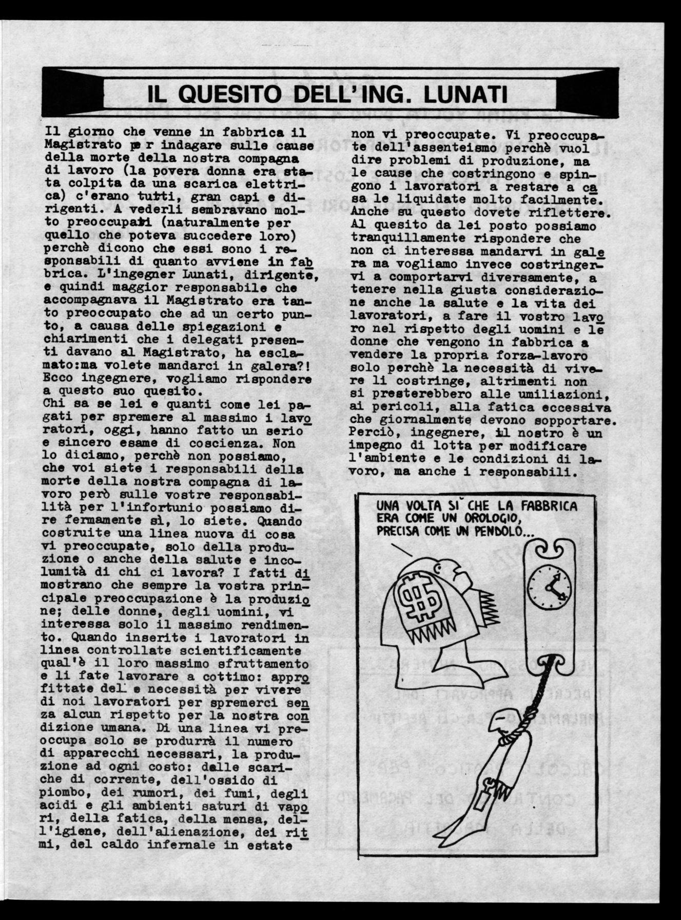 Il giorno che venne in fabbrica il Magistrato per indagare sulle cause della morte della nostra compagna di lavoro (la povera donna era star• ta colpita da una scarica elettrica) c'erano tutti, gran capi e dirigenti. A vederli sembravano molto preoccupati (naturalmente per quello che poteva succedere loro) perchè dicono che essi sono i responsabili di quanto avviene in fab brica. L'ingegner Lunati, dirigente, e quindi maggior responsabile che accompagnava il Magistrato era tanto preoccupato che ad un certo punto, a causa delle spiegazioni e chiarimenti che i delegati presenti davano al Magistrato, ha esclamato:ma volete mandarci in galera?! Ecco ingegnere, vogliamo rispondere a questo suo quesito. Chi sa se lei e quanti come lei pagati per spremere al massimo i lavo ratori, oggi, hanno fatto un serio e sincero esame di coscienza. Non lo diciamo, perchè non possiamo, che voi siete i responsabili della morte della nostra compagna di lavoro però sulle vostre responsabilità per l'infortunio possiamo dire fermamente sì, lo siete. Quando costruite una linea nuova di cosa vi preoccupate, solo della produzione o anche della salute e incolumità di chi ci lavora? I fatti di mostrano che sempre la vostra principale preoccupazione è la produzi2 ne; delle donne, degli uomini, vi interessa solo il massimo rendimento. Quando inserite i lavoratori in linea controllate scientificamente qual'è il loro massimo sfruttamento e li fate lavorare a cottimo: appr2 fittate del: e necessità per vivere di noi lavoratori per spremerci sen za alcun rispetto per la nostra con" dizione umana. Di una linea vi preoccupa solo se produrrà il numero di apparecchi necessari, la produzione ad ogni costo: dalle scariche di corrente, dell'ossido di piombo, dei rumori, dei fumi, degli acidi e gli ambienti saturi di vapo ri, della fatica, della mensa, dell'igiene, dell'alienazione, dei rit mi, del caldo infernale in estate