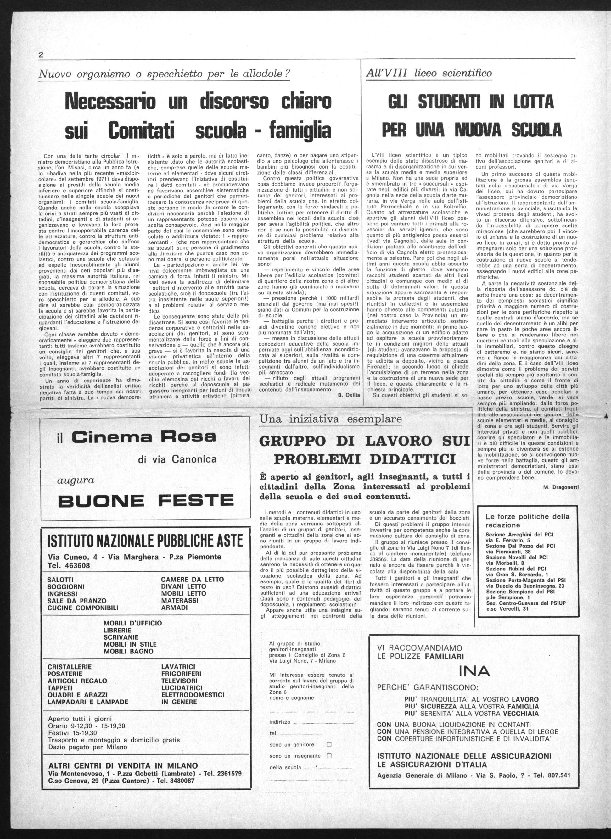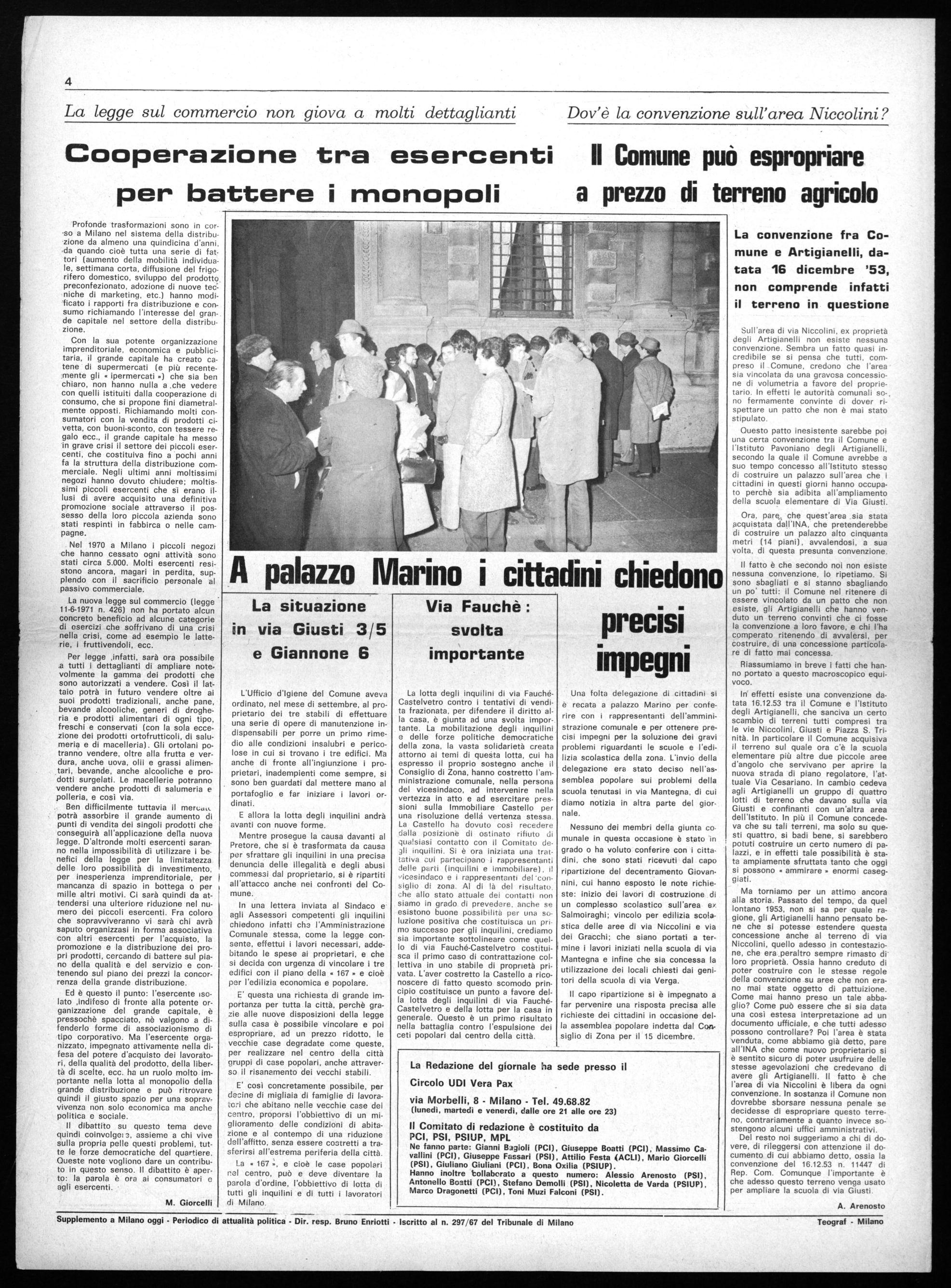La Redazione del giornale ha sede presso il Circolo UDI Vera Pax via Morbelli, 8 - Milano - Tel. 49.68.82 (lunedì, martedì e venerdì, dalle ore 21 alle ore 23) Il Comitato di redazione è costituito da PCI, PSI, PSIUP, MPL Ne fanno parte: Gianni Bagioli (PCI), Giuseppe Boatti (PCI), Massimo Cavallini (PCI), Giuseppe Fassari (PSI), Attilio Festa (ACLI), Mario Giorcelli (PSI), Giuliano Giuliani (PCI), Bona Oxilia (PSIUP). Hanno inoltre !collaborato a questo numero: Alessio Arenosto (PSI). Antonello Boatti (PCI), Stefano Demolii (PSI), Nicoletta de Varda (PSIUP), Marco Dragonetti (PCI), Toni Muzi Falconi (PSI).