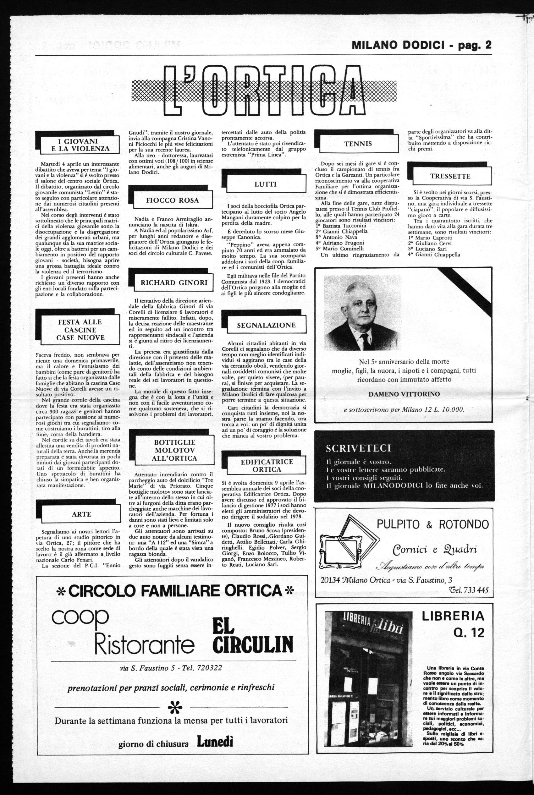A Nadia ed al popolarissimo Arf, per lunghi anni redattore e disegnatore dell'Ortica giungano le felicitazioni di Milano Dodici e dei soci del circolo culturale C. Pavese.