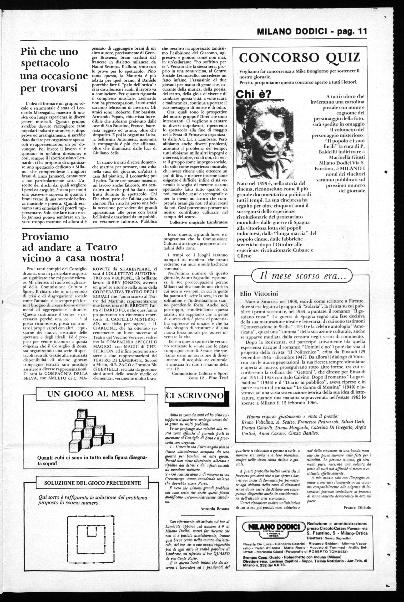 ROWITZ da SHÀKESPEARE, ci sarà il COLLETTIVO AUTOTEATRO con VOLPONE, un brillante lavoro di BEN JONSON, avremo un gradito ritorno nella zona della COOPERATIVA TEATRO DEGLI EGUALI che l'anno scorso al Teatro dei Martinitt rappresentarono due farse, una di B. BRECHT, l'altra di DARIO FO, e che quest'anno proporranno un rinnovato repertorio: IL CASTELLO MISTERIOSO, una fiaba per ragazzi, e IL CIARLONE, che ha ottenuto recentemente un buon successo al Teatro del Vecchio Verziere; vedremo la COMPAGNIA SPECCHIO MAGICO, con MAGIC di CHESTERTO N, ed infine potremo assistere a due rappresentazioni del TEATRO DI LAMBRATE: Succed a Milan, di R. ZAGO e Formica Blu di BERTELLI, recitata da giovanissimi attori delle scuole medie ed elementari, veramente molto bravi.