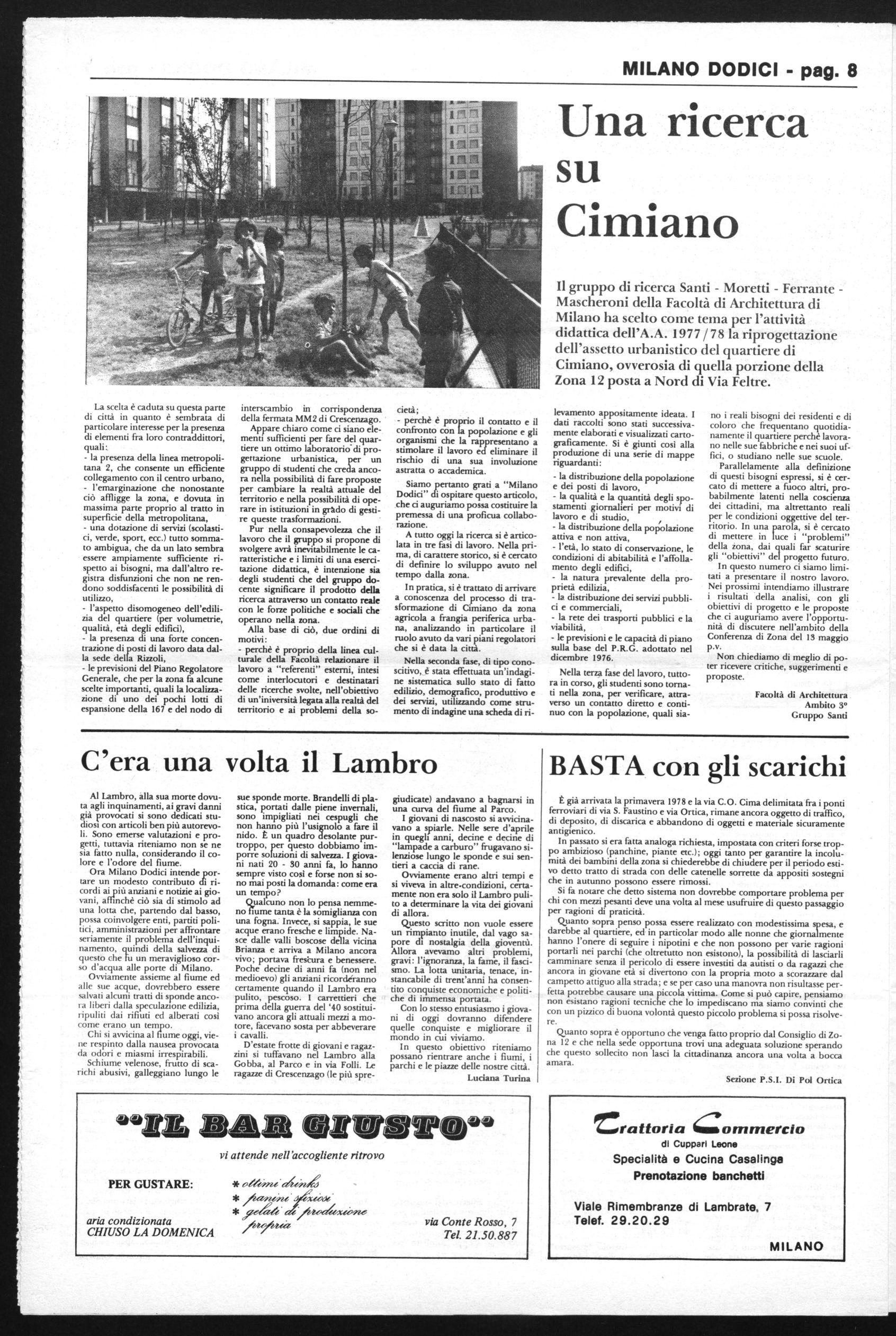 Con riferimento all'articolo sui bar di Lambrate apparso sul numero 8-9 di Milano Dodici, vorrei far rilevare che non si è parlato assolutamente, tranne quel breve cenno nella testata dell'articolo, del bar che a mio avviso rispecchia più di ogni altro la realtà popolare di Lambrate, mi riferisco al bar QUASSO di via Conte Rosso.