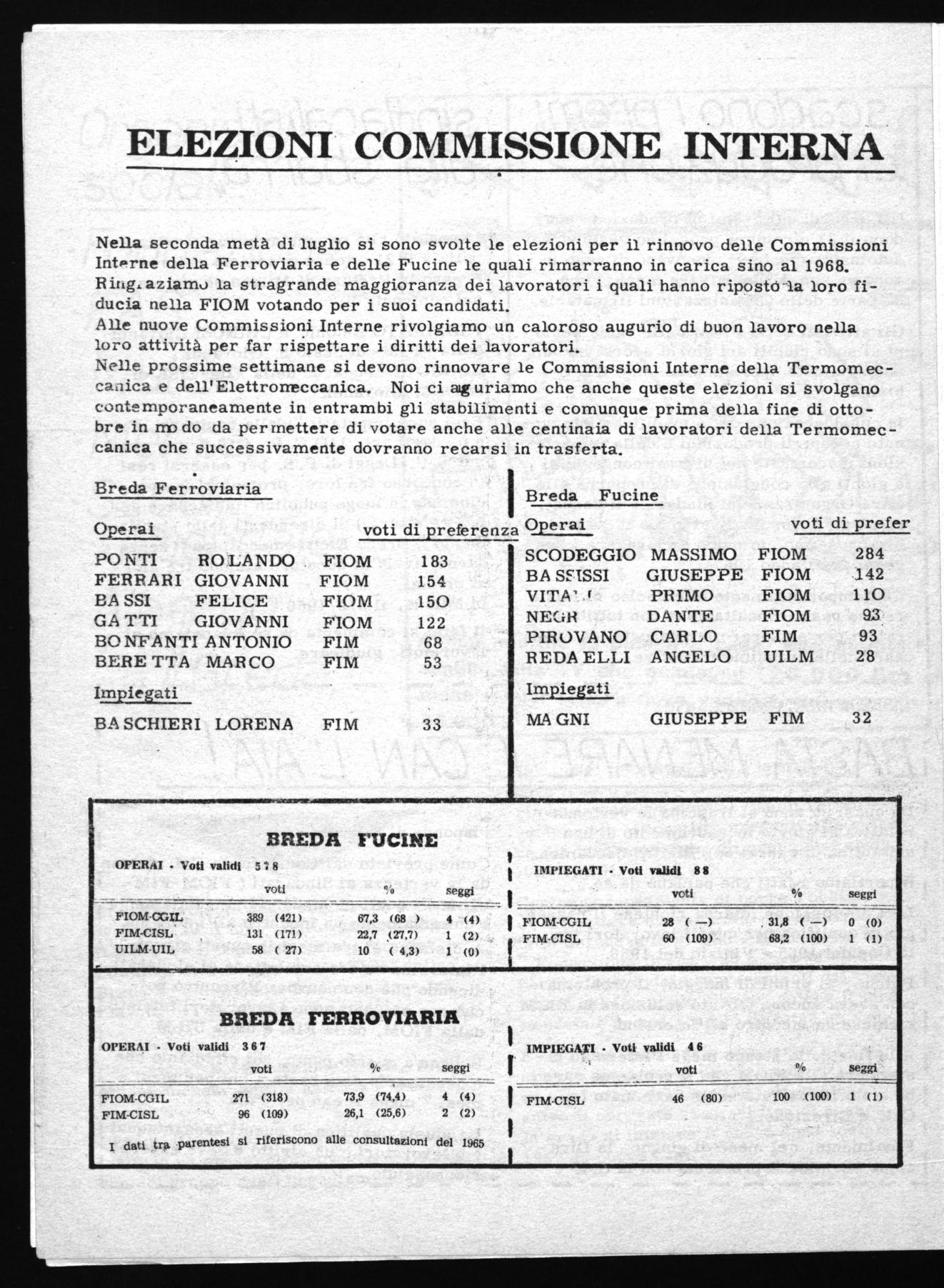 Nella seconda metà di luglio si sono svolte le elezioni per il rinnovo delle Commissioni IntPrne della Ferroviaria e delle Fucine le quali rimarranno in carica sino al 1968. Riug‘aziamo la stragrande maggioranza dei lavoratori i quali hanno ripostò la loro fiducia nella FIOM votando per i suoi candidati.