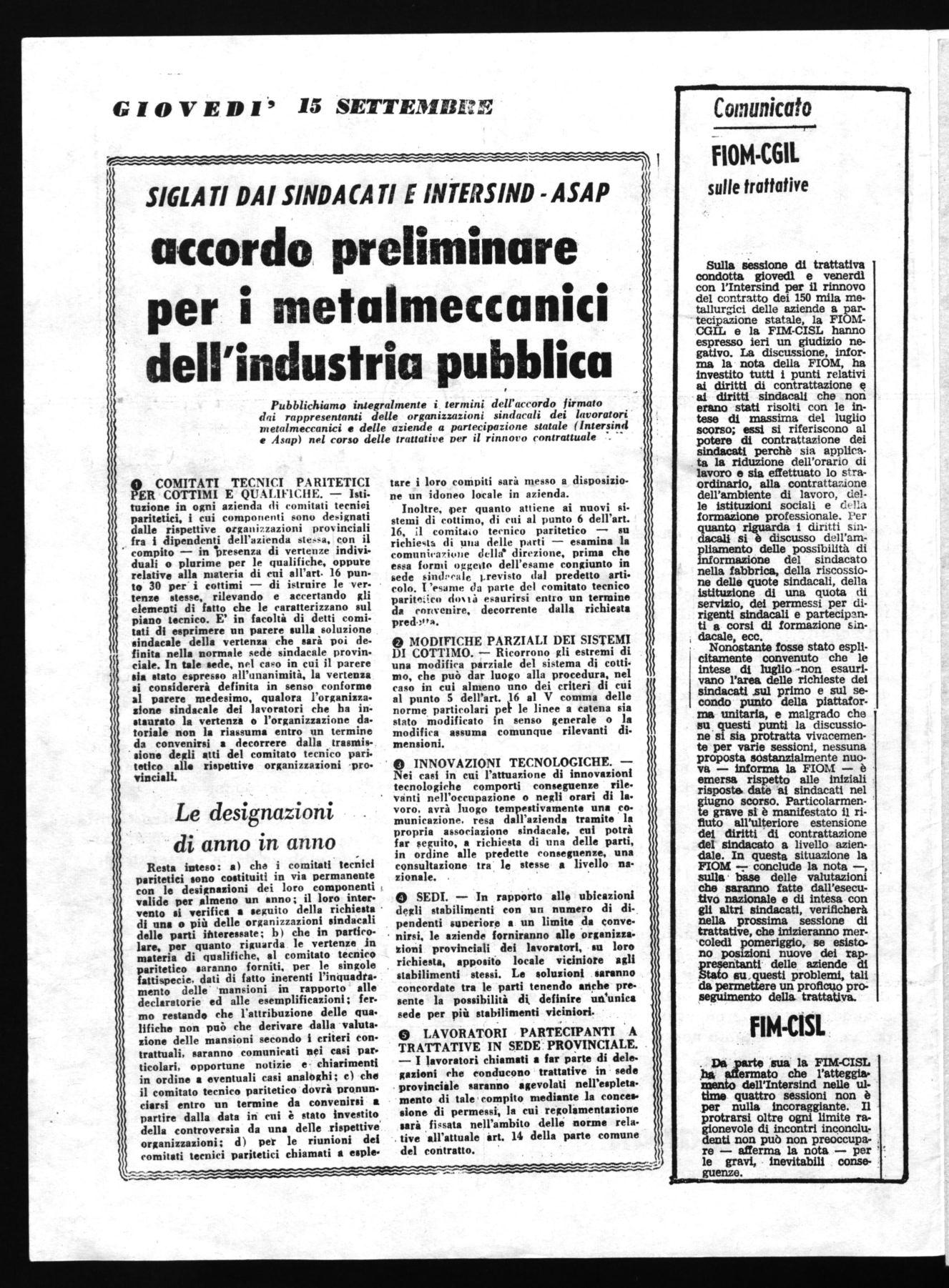 Pubblichiamo integralmente i termini dell'accordo firmato dai rappresentanti delle organizzazioni sindacali dei lavoratori metalmeccanici e delle aziende a partecipazione statale (Intersind e Asap) nel corso delle trattative per il rinnovo contrattuale
