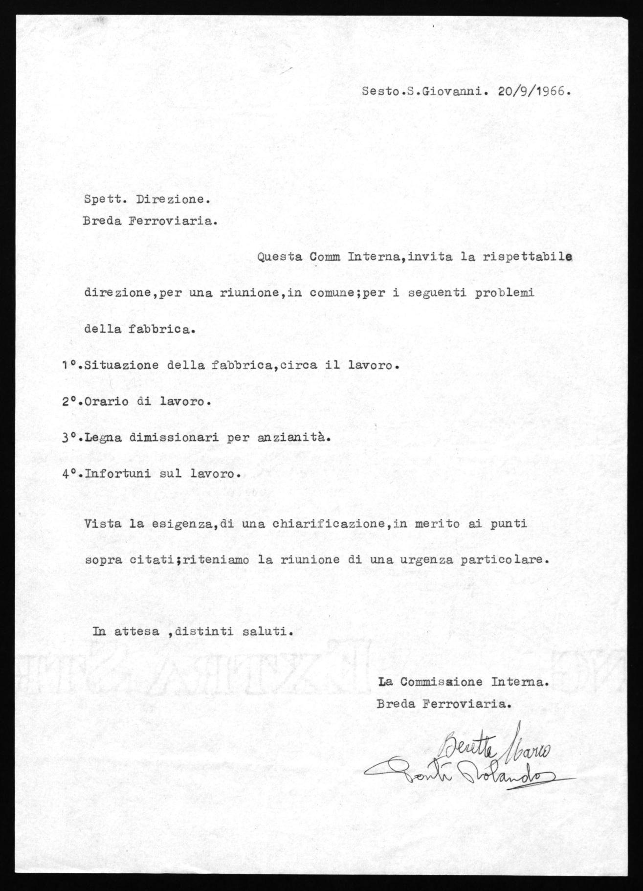 Questa Comm Interna,invita la rispettabile direzionelper una riunione,in comune;per i seguenti problemi della fabbrica.