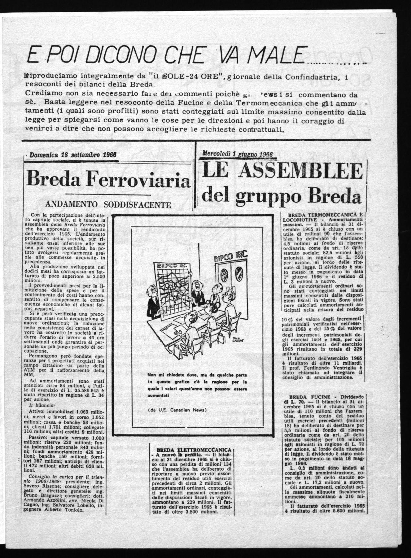 Riproduciamo integralmente da "il SOLE-24 ORE", g iornale della Confindustria, i resoconti dei bilanci della Breda Crediamo non sia necessario fai e dei commenti poichè gi rews i si commentano da sè. Basta leggere nel resoconto della Fucine e della Terrnomeccanica che gli animitamenti (i quali sono profitti) sono stati conteggiati sul limite massimo consentito dalla legge per spiegarsi come vanno le cose per le direzioni e poi hanno il coraggio di venirci a dire che non possono accogliere le richieste contrattuali.