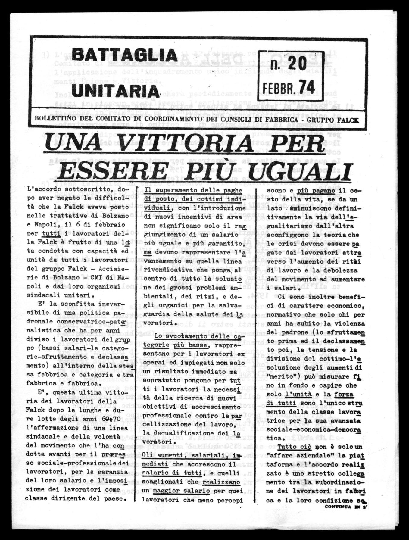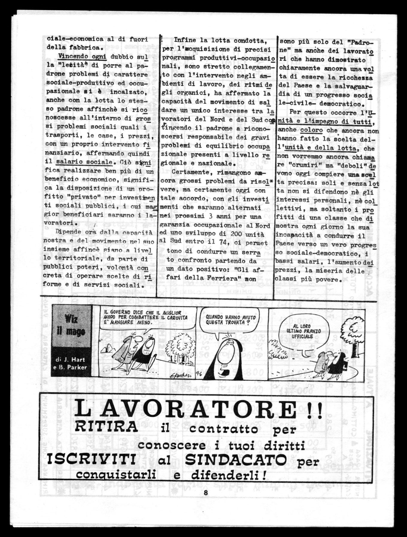Infine la lotta condotta, per l'acquisizione di precisi programmi produttivi-occupazit nali, sono stretto collegamento con l'intervento negli ambienti di lavoro, dei ritmi d2 gli organici, ha affermato la capacità del movimento di sal dare un unico interesse tra la voratori del Nord e del Sudcop tingendo il padrone a riconoscersi responsabile dei gravi problemi di equilibrio occupa zionale presenti a livello re gionale e nazionale.