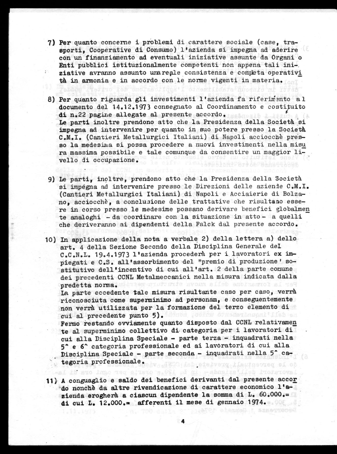 Per quanto riguarda gli investimenti l'azienda fa riferirémito al documento del 14.12.1973 consegnato al Coordinamento e costruito di n.22 pagine allegate al presente accordo. Le parti inoltre prendono atto che la Presidenza della Società.si impegna ad intervenire per quanto in suo potere presso la Società C.M.I. (Cantieri Metallurgici Italiani) di Napoli acciocchè presso la medesima si possa procedere a nuovi investimenti nella misu ra massima possibile e tale comunque da consentire un maggior livello di occupazione.