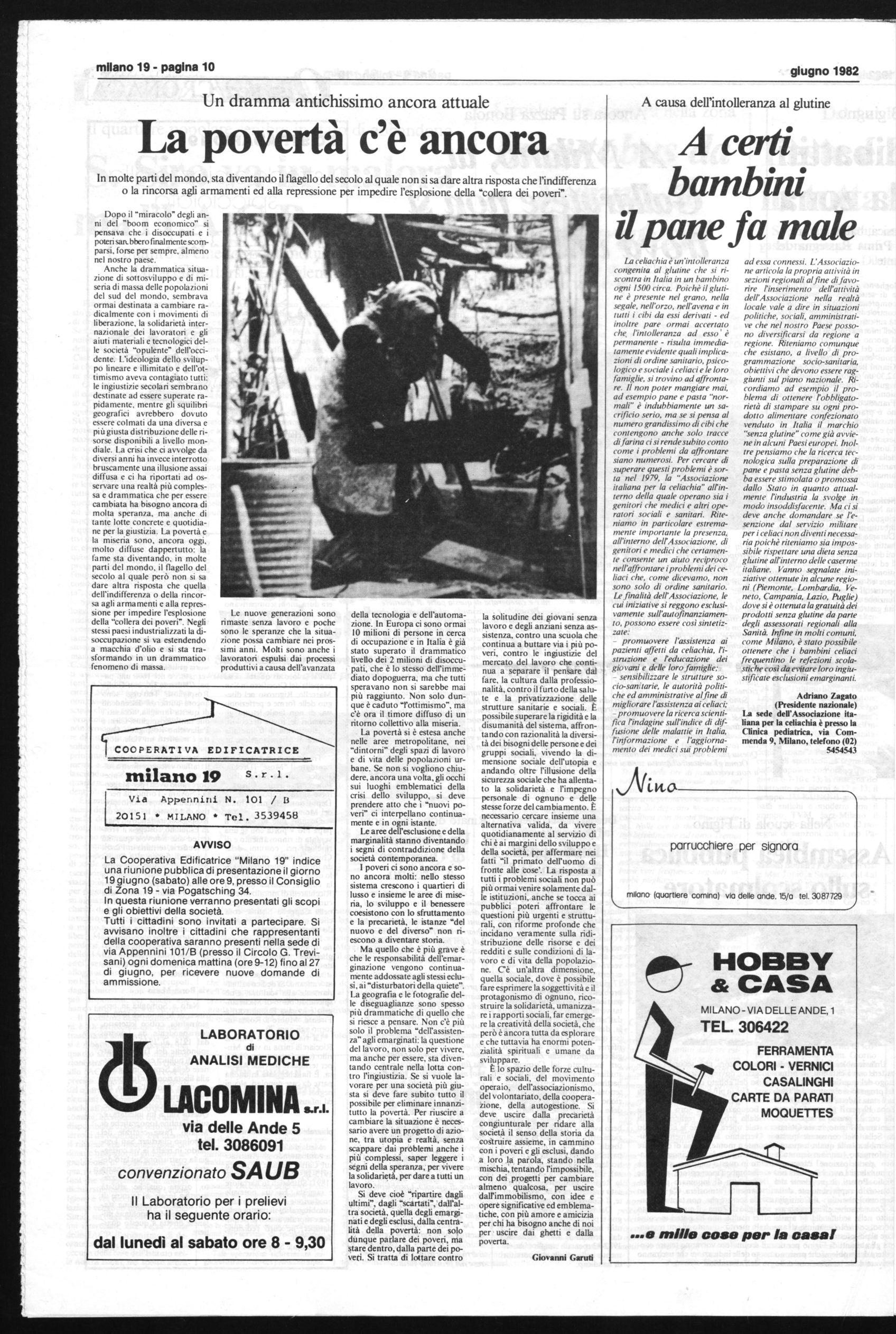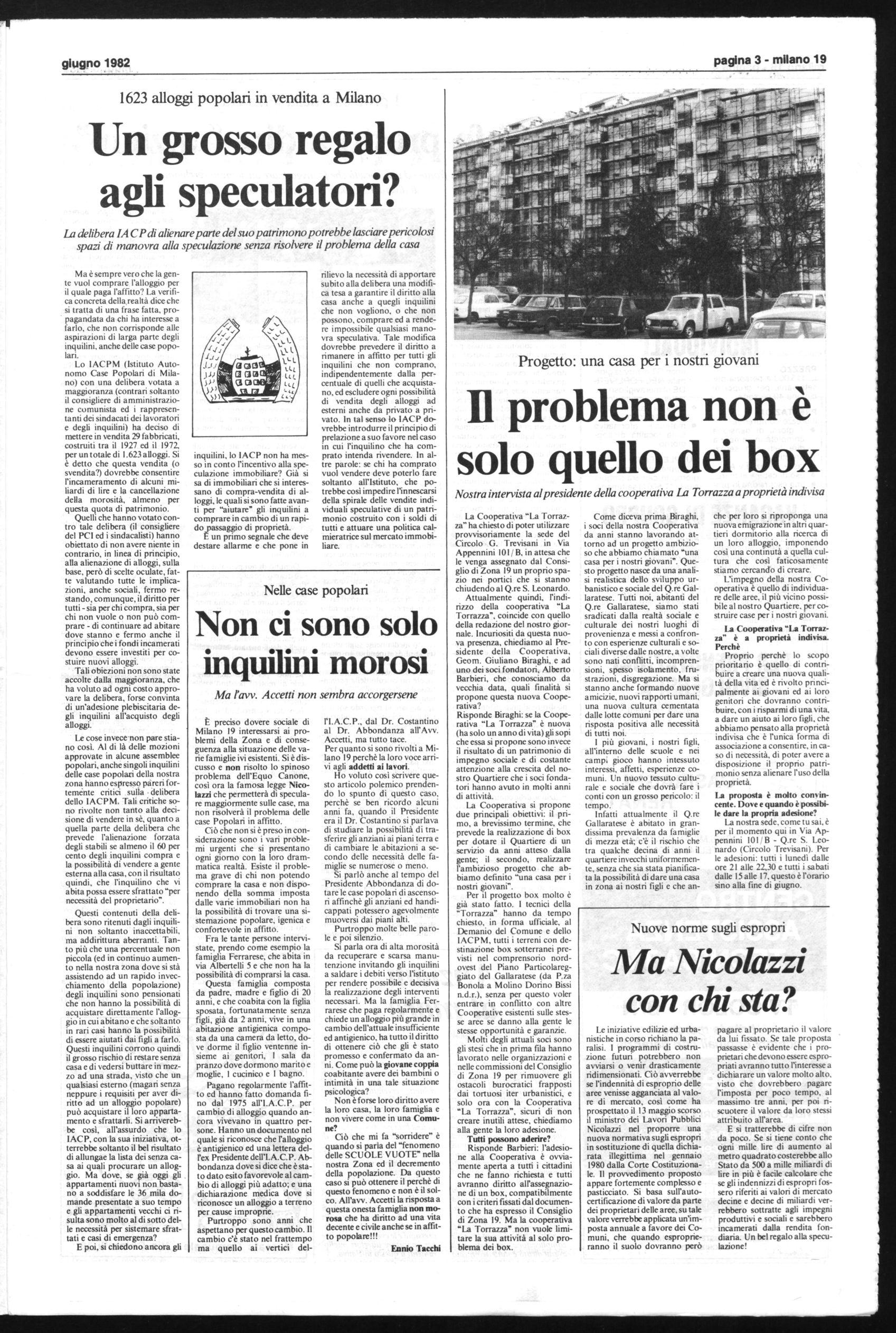 E preciso dovere sociale di Milano 19 interessarsi ai problemi della Zona e di conseguenza alla situazione delle varie famiglie ivi esistenti. Si è discusso e non risolto lo spinoso problema dell'Equo Canone, così ora la famosa legge Nicolazzi che permetterà di speculare maggiormente sulle case, ma non risolverà il problema delle case Popolari in affitto. Ciò che non si è preso in considerazione sono i vari problemi urgenti che si presentano ogni giorno con la loro drammatica realtà. Esiste il problema grave di chi non potendo comprare la casa e non disponendo della somma imposta dalle varie immobiliari non ha la possibilità di trovare una sistemazione popolare, igenica e confortevole in affitto.